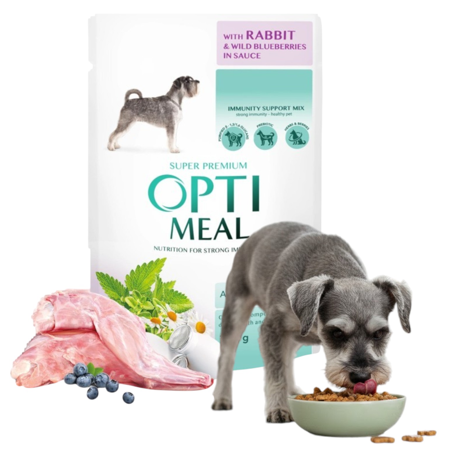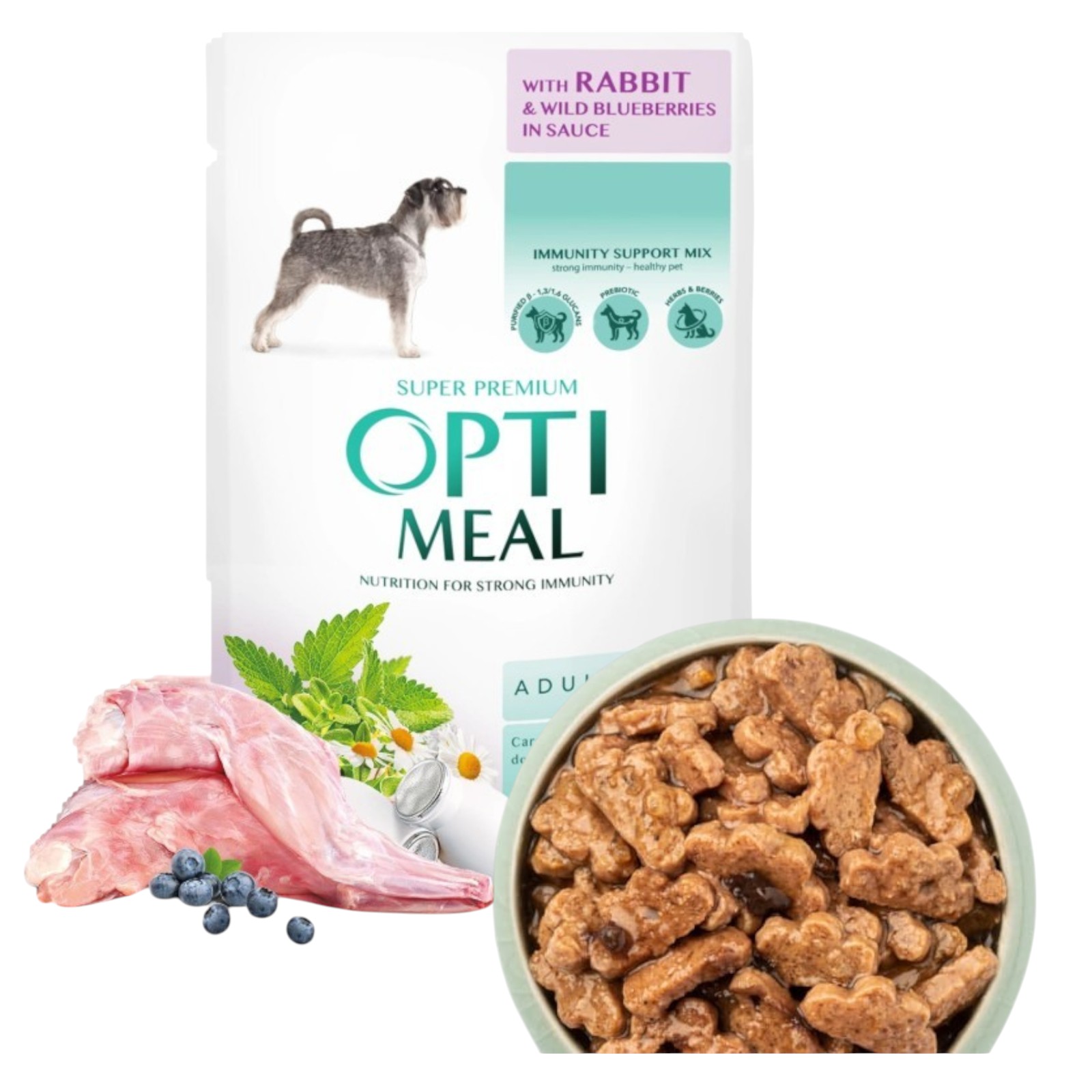 Optimeal pełnoporcjowa mokra karma dla dorosłych psów z królikiem i jagodami w sosie – karma super premium opracowana pod kontrolą lekarzy weterynarii. W jej skład wchodzi unikalny mix ziół, jagód, wyselekcjonowanych składników mięsnych oraz prebiotyków.