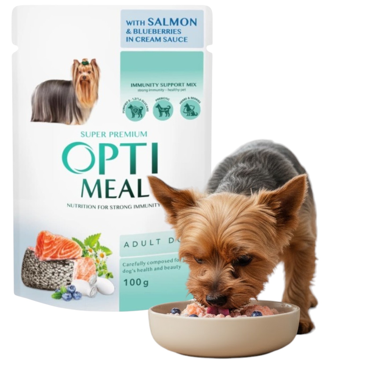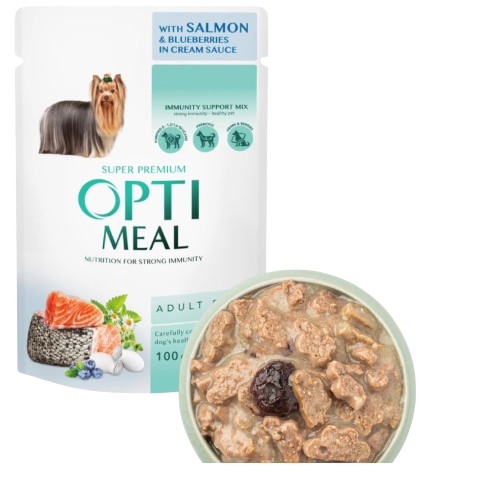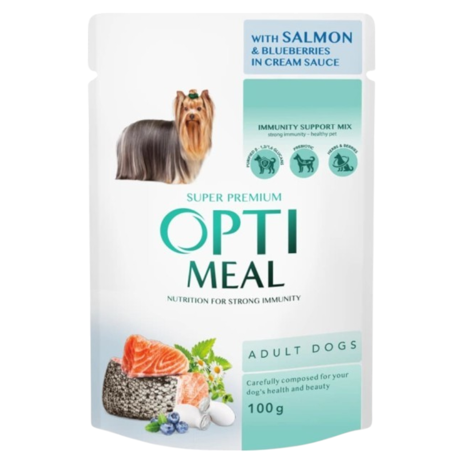 Optimeal pełnoporcjowa mokra karma dla dorosłych psów z łososiem i borówkami w sosie kremowym – karma super premium dla dorosłych psów, opracowana pod kontrolą lekarzy weterynarii. W jej skład wchodzi unikalny mix ziół, jagód, wyselekcjonowanych składników mięsnych i prebiotyków.