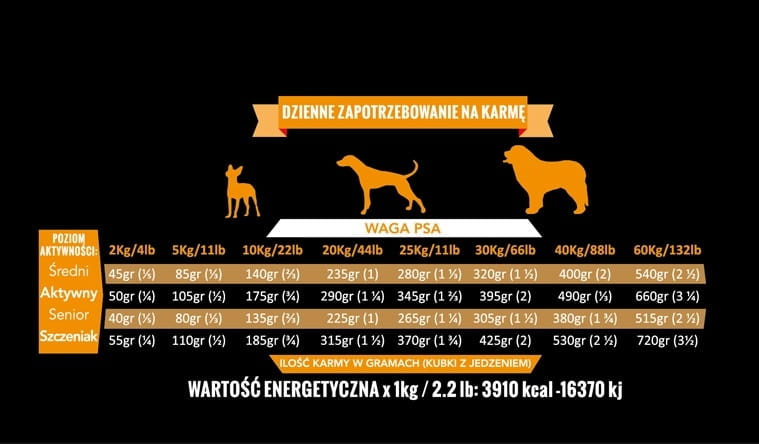 - Energia metaboliczna na kg: 3307 kcal / 13837 kJ.