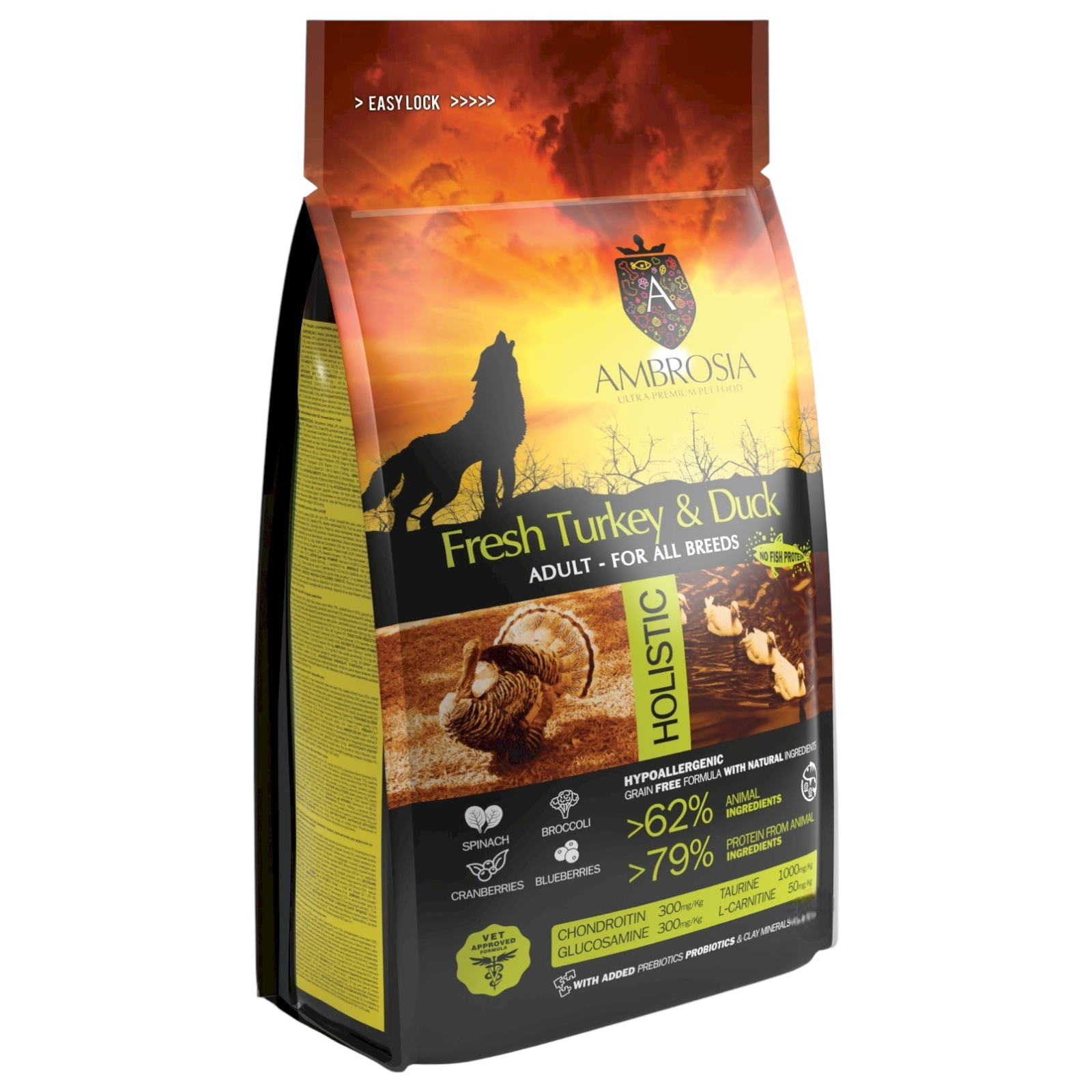 Karma AMBROSIA Fresh Turkey & Duck to produkt holistyczny, którego nadrzędnym celem jest dbałość o zdrowie i witalność całego organizmu psa. Połączenie indyka i kaczki dostarcza szlachetnych białek o wysokiej wartości biologicznej, które są niezwykle łatwo przyswajalne. Dzięki temu organizm pupila otrzymuje komplet niezbędnych aminokwasów, co przekłada się na silny układ odpornościowy oraz lśniącą, zdrową okrywę włosową.