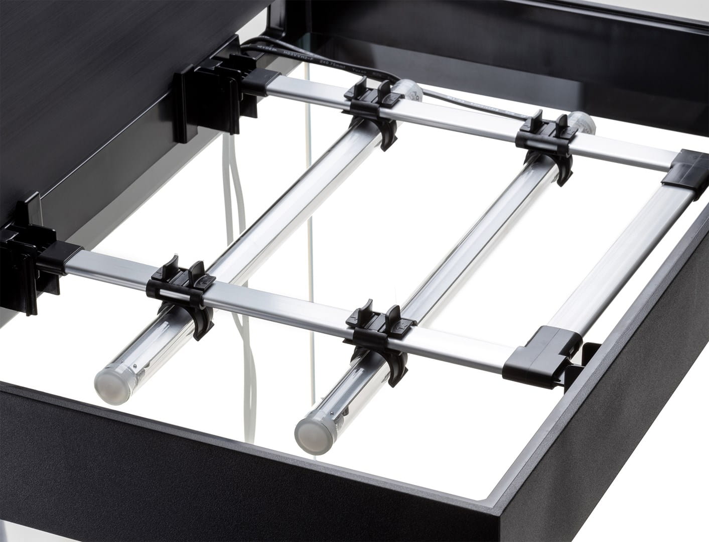 Ale to nie koniec możliwych modyfikacji. Szyny pozwalają na wygodną zmianę miejsca modułów oświetleniowych, dzięki czemu można równomiernie oświetlić całe akwarium lub tylko jego wybraną część.
