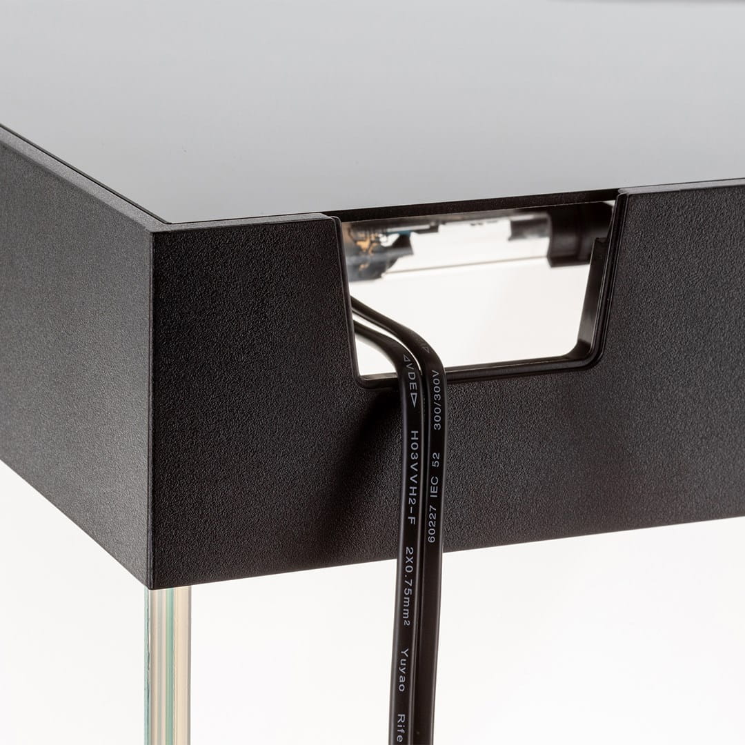 Rama doskonale komponuje się też z elegancką pokrywą, wyposażoną w opatentowany system Smart Open. System ten umożliwia łatwe otwarcie i zatrzymanie pokrywy w pożądanej pozycji. W pokrywie umieściliśmy zamykane okienko, przez które wygodnie nakarmisz ryby. Otwory techniczne na tylnej ścianie akwarium przeznaczone są na węże filtra zewnętrznego. Poprowadzisz tam także przewody służące do zasilania urządzeń elektrycznych akwarium. Koniec z nieestetycznie wiszącymi kablami!