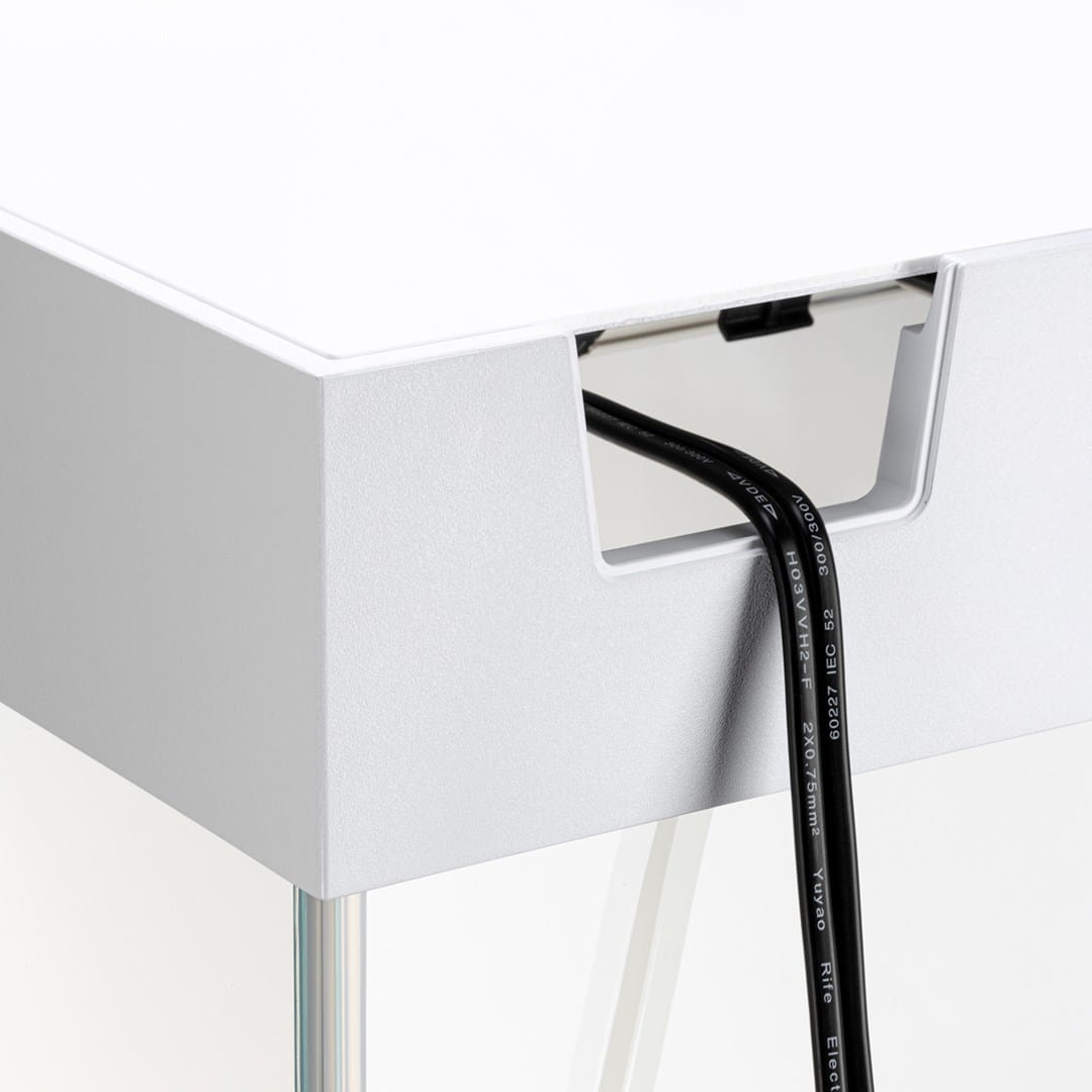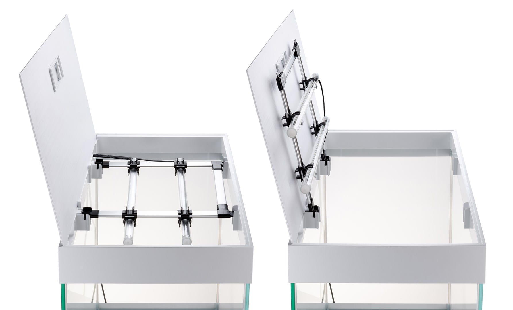 Rama doskonale komponuje się też z elegancką pokrywą, wyposażoną w opatentowany system Smart Open. System ten umożliwia łatwe otwarcie i zatrzymanie pokrywy w pożądanej pozycji. W pokrywie umieściliśmy zamykane okienko, przez które wygodnie nakarmisz ryby. Otwory techniczne na tylnej ścianie akwarium przeznaczone są na węże filtra zewnętrznego. Poprowadzisz tam także przewody służące do zasilania urządzeń elektrycznych akwarium. Koniec z nieestetycznie wiszącymi kablami!