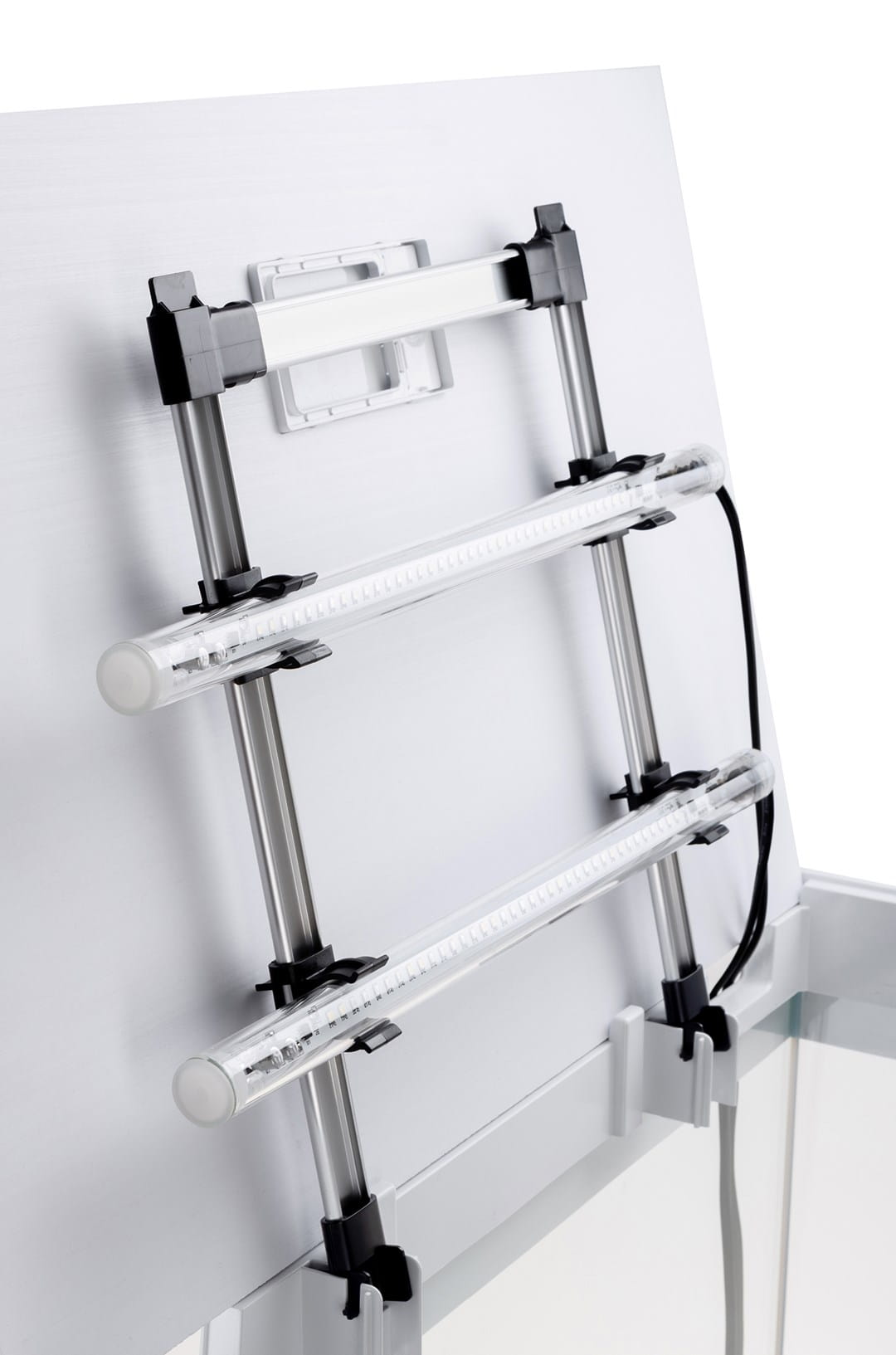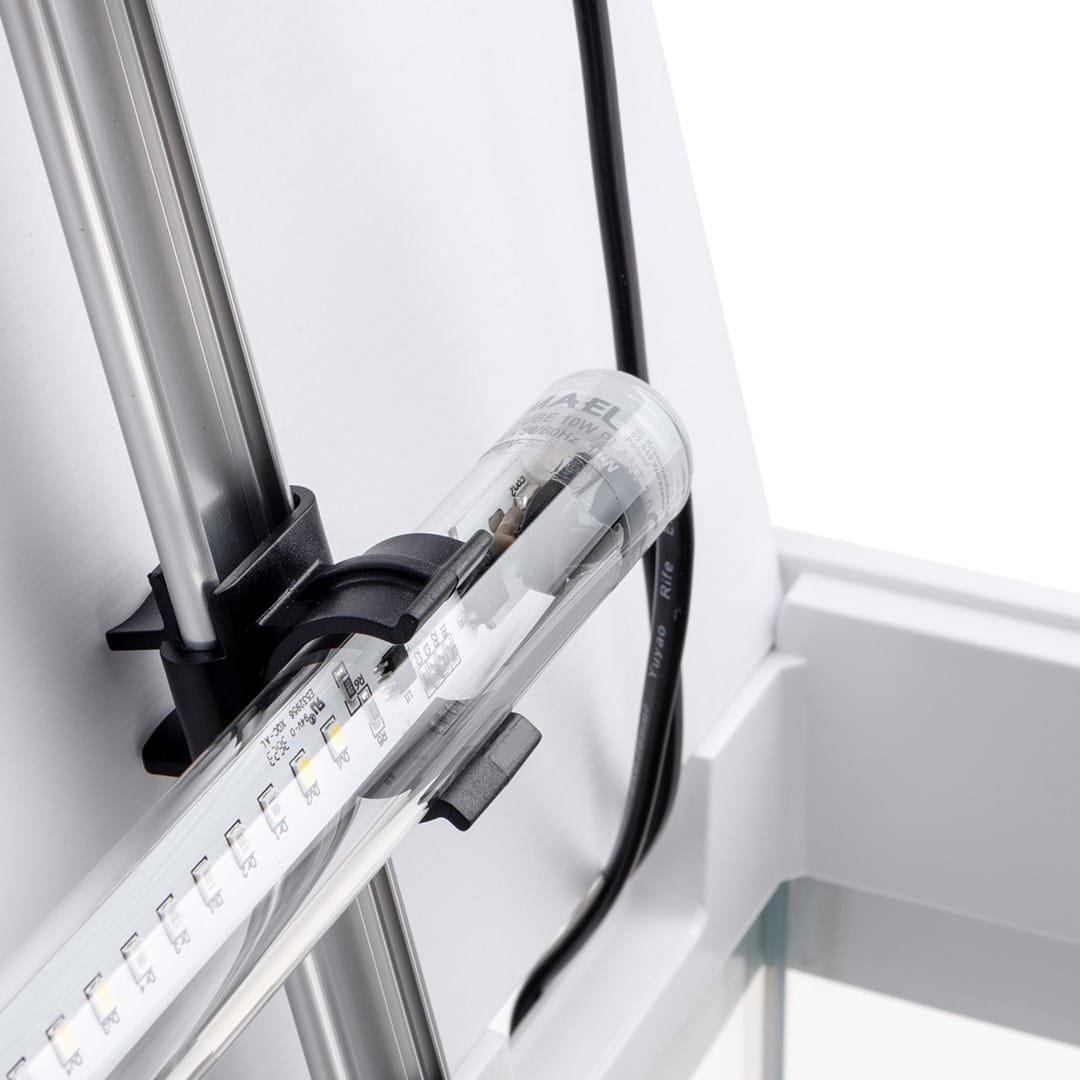 Tuż pod pokrywą, we wnętrzu zbiornika znajdują się dwie szyny, na których zamieszczono ledowe oświetlenie Aquael Leddy Tube Sunny Day & Night 2.0. Moduły mają moc 10 W, co jest idealnie dopasowane do wielkości tego zbiornika.