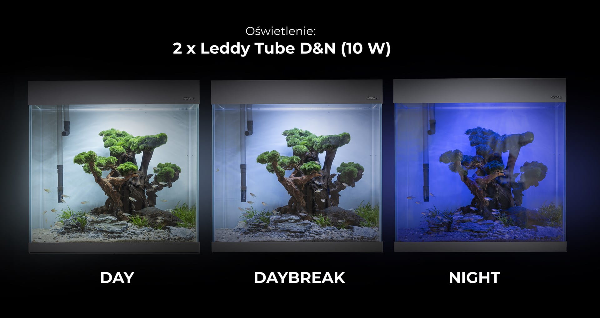 - tryb Daybreak to światło delikatne, które zapewnia w zbiorniku odpowiedni nastrój wieczorem.