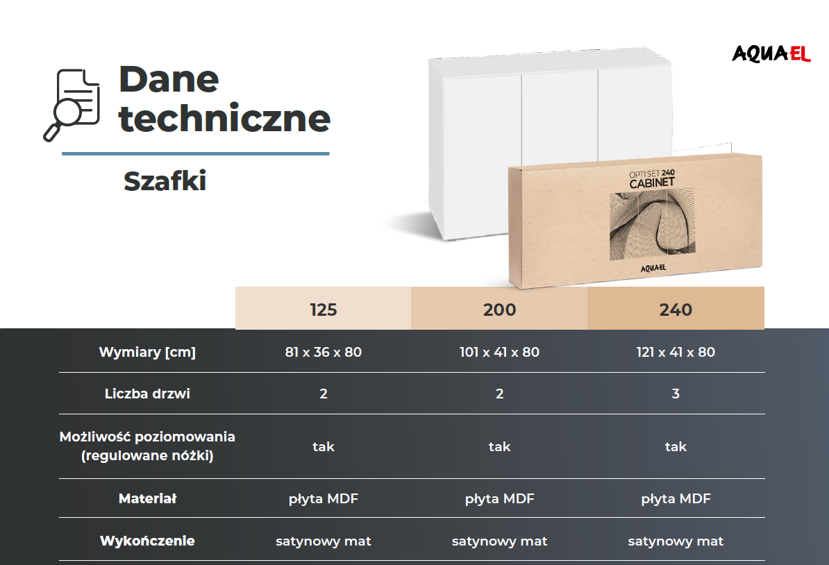 Szafka dedykowana pod akwarium OptiSet. Szafka posiada krótszy blat dzięki czemu akwarium idealnie zachodzi nad drzwiczki, tworząc z nią równą bryłę. Taki zabieg zapewnia nowoczesny wygląd zestawu przy zachowaniu pełnego bezpieczeństwa użytkowania zbiornika.