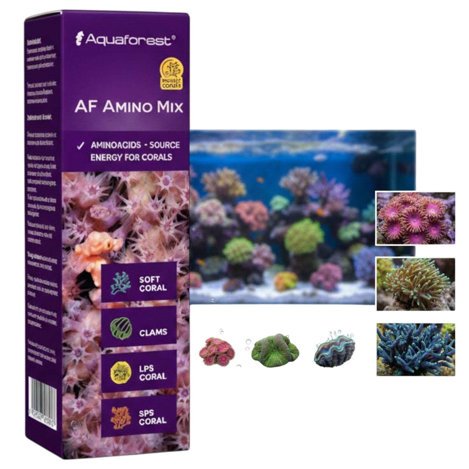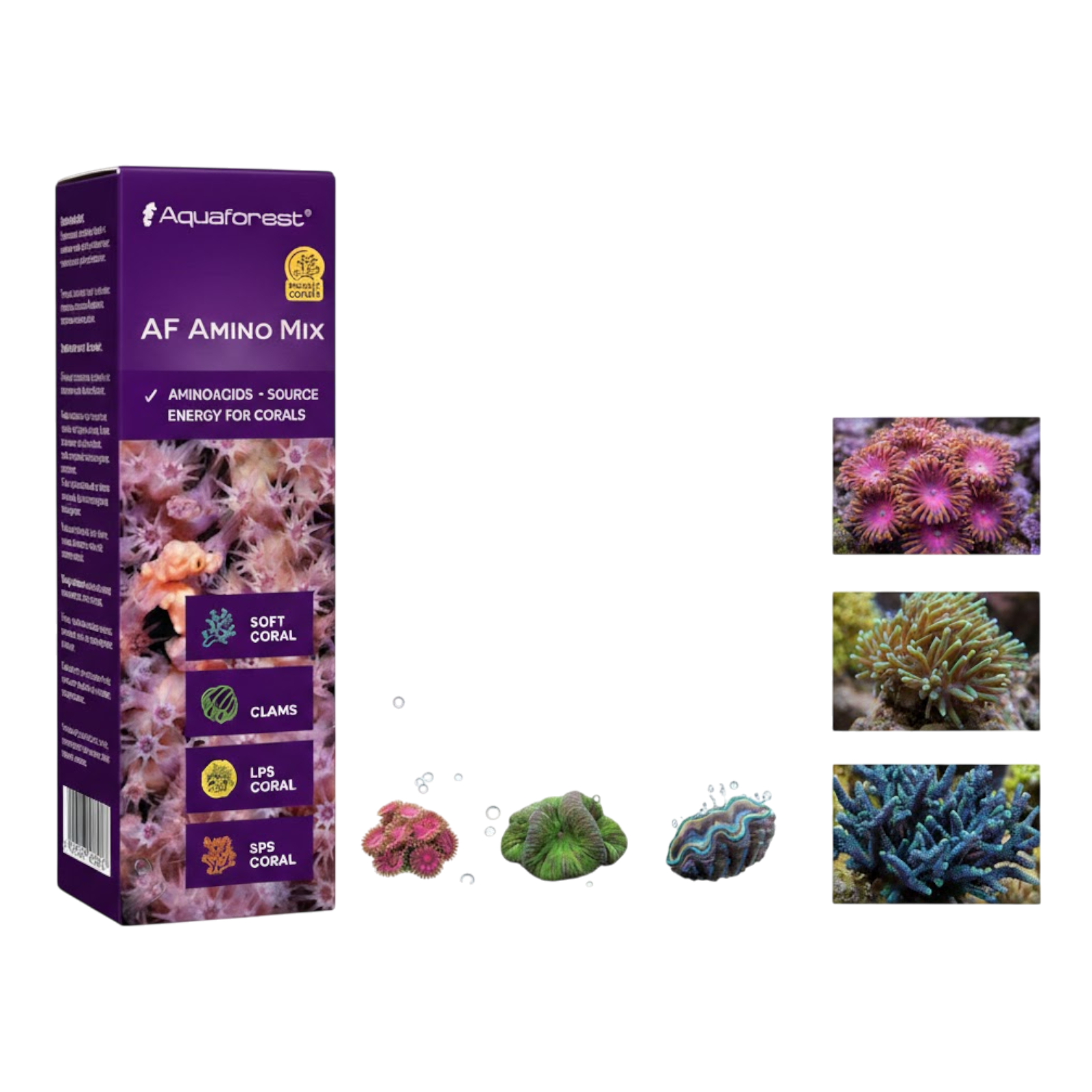 AF Amino Mix uzupełnia wodę we wszystkie niezbędne aminokwasy, dzięki czemu zapobiega bieleniu koralowców i podkreśla intensywność ich barw. Unikalna kompozycja AF Amino Mix zawiera m.in. biotynę, alaninę, glutaminę, leucynę, lizynę i serynę. Odpowiednio dobrany zestaw aminokwasów zwiększa ilość zooksantelli i wspomaga produkcję barwników fotosyntetycznych m.in. chlorofilu. Wpływa to pozytywnie nie tylko na wybarwienie korali, ale także podnosi jakość procesu fotosyntezy. Czerpiące ze światła więcej energii koralowce pozostają w świetnej kondycji i rosną szybciej. Regularne stosowanie preparatu poprawia odporność i zauważalnie przyspiesza wzrost koralowców.