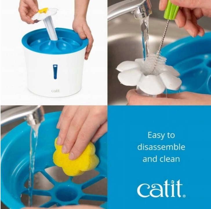 Czyszczenie zalecane jest 1x tygodniowo. Zbiornik należy umyć normalnym środkiem myjącym i dokładnie spłukać. Osady z kamienia oraz pompę najlepiej umyć przy pomocy octu. Wymiana filtra zalecana jest co ok 3-4 tygodnie w zależności od intensywności użytkowania przez zwierzęta oraz stopnia zabrudzenia.