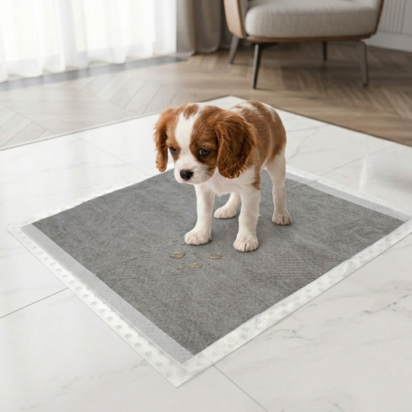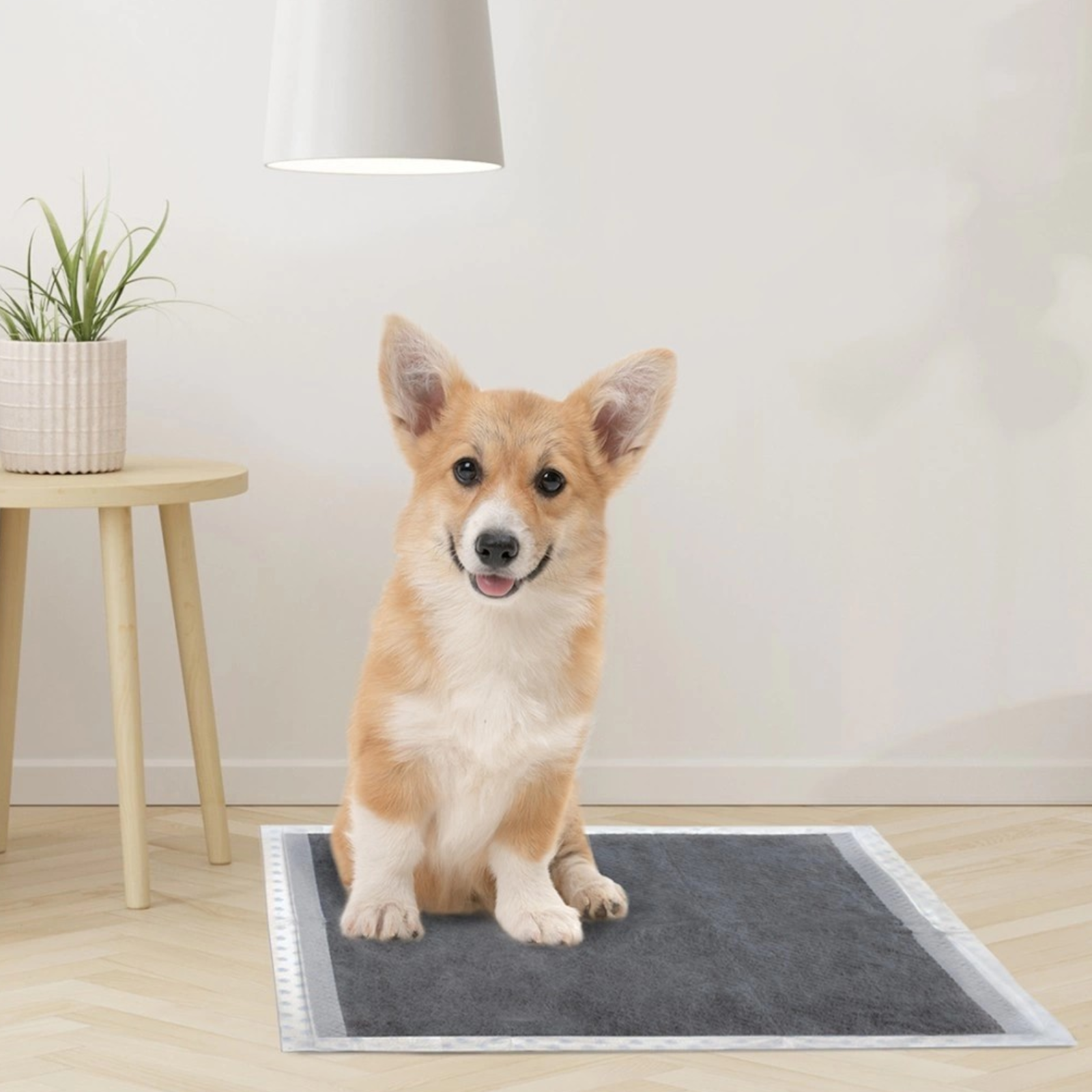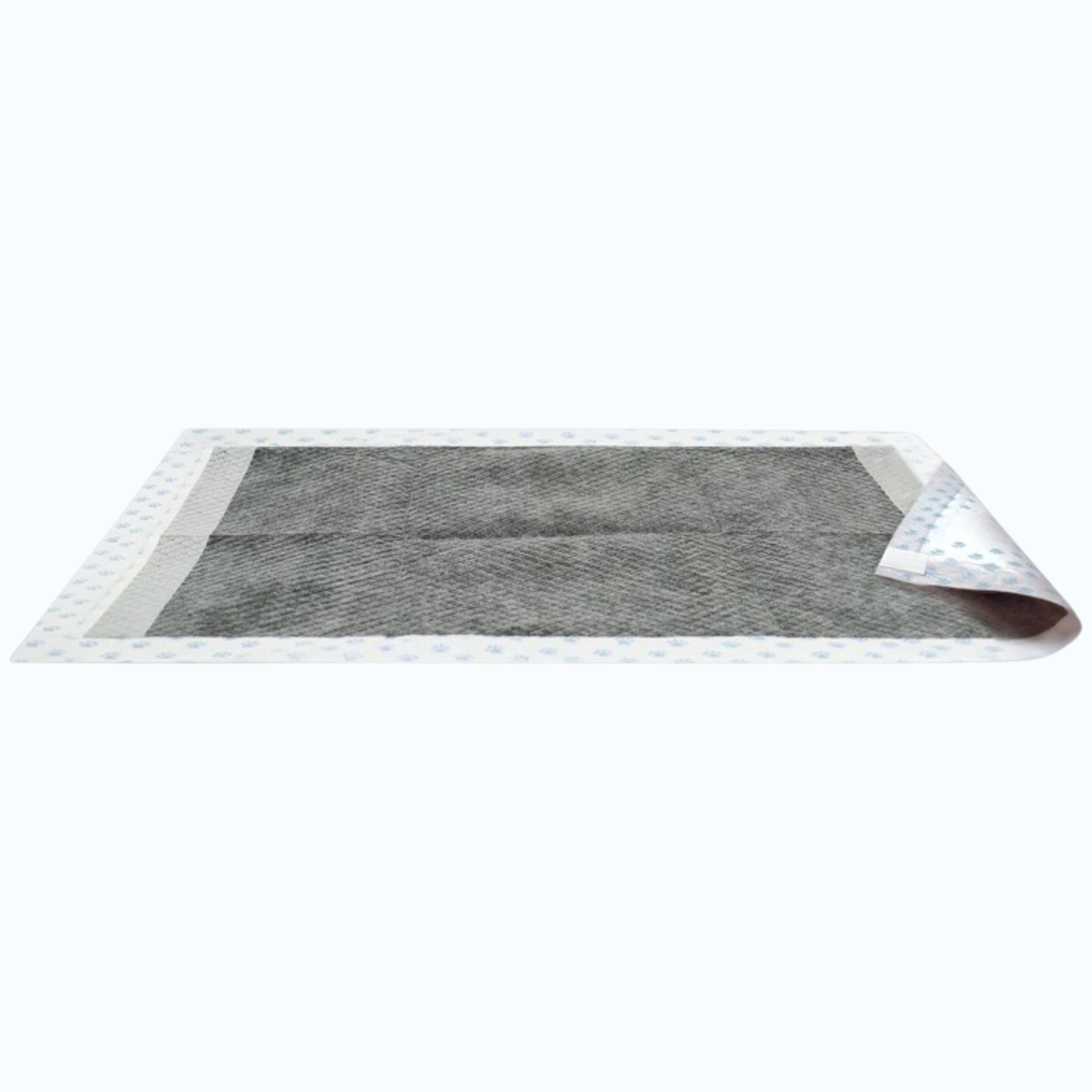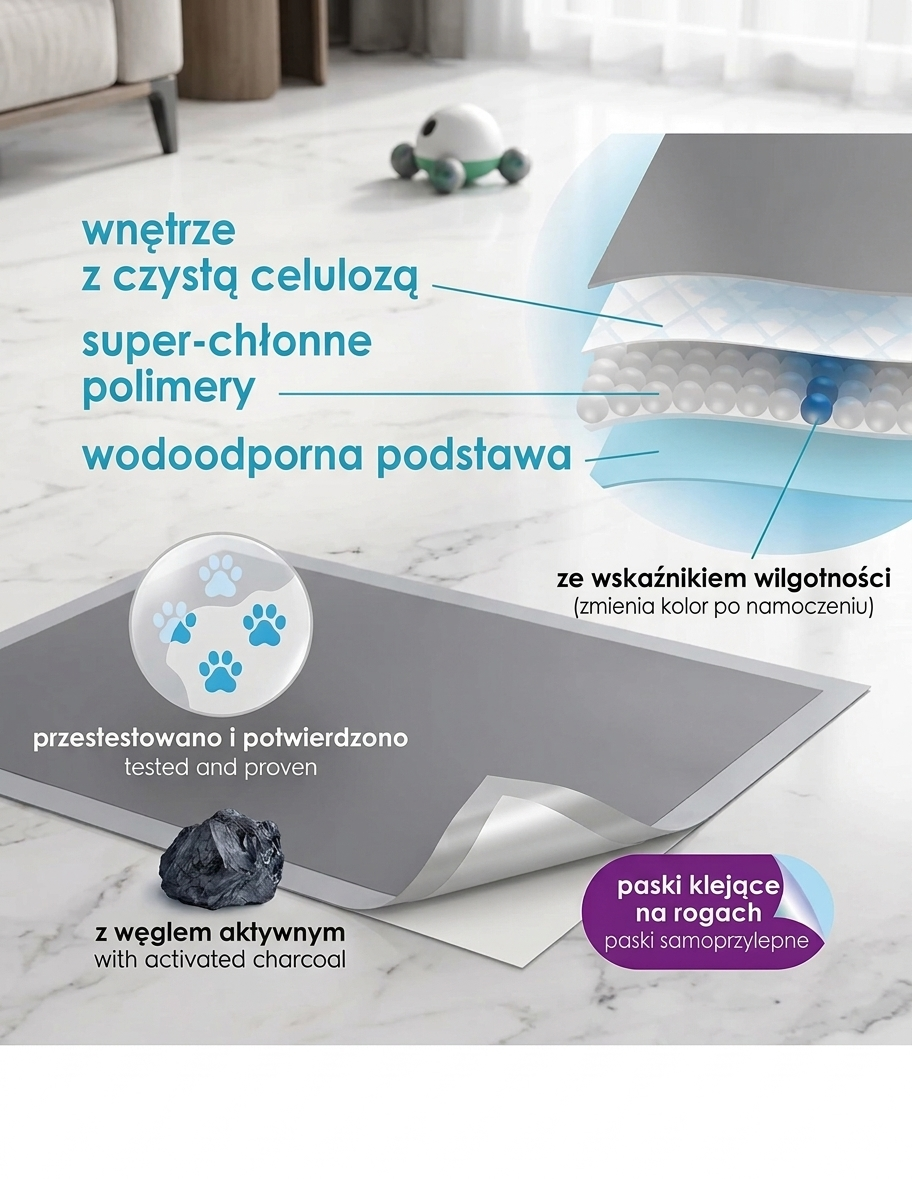 Higieniczne maty z węglem aktywnym to produkt klasy premium, zaprojektowany z myślą o najbardziej wymagających właścicielach czworonogów. Zastosowanie roślinnego węgla aktywnego sprawia, że podkłady nie tylko maskują, ale realnie eliminują nieprzyjemne zapachy, co jest kluczowe przy nauce czystości w mieszkaniu. Dzięki charakterystycznej, ciemnej barwie warstwy chłonnej, ewentualne zabrudzenia są mniej widoczne, co podnosi estetykę kącika higienicznego Twojego pupila.