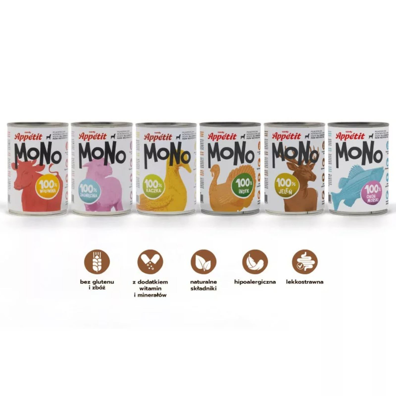 Comfy Appetit MONO to pełnoporcjowa, jednobiałkowa mokra karma dla psów dorosłych, stworzona na bazie naturalnych składników. Produkt zawiera 96% mięsa i składników pochodzenia zwierzęcego.