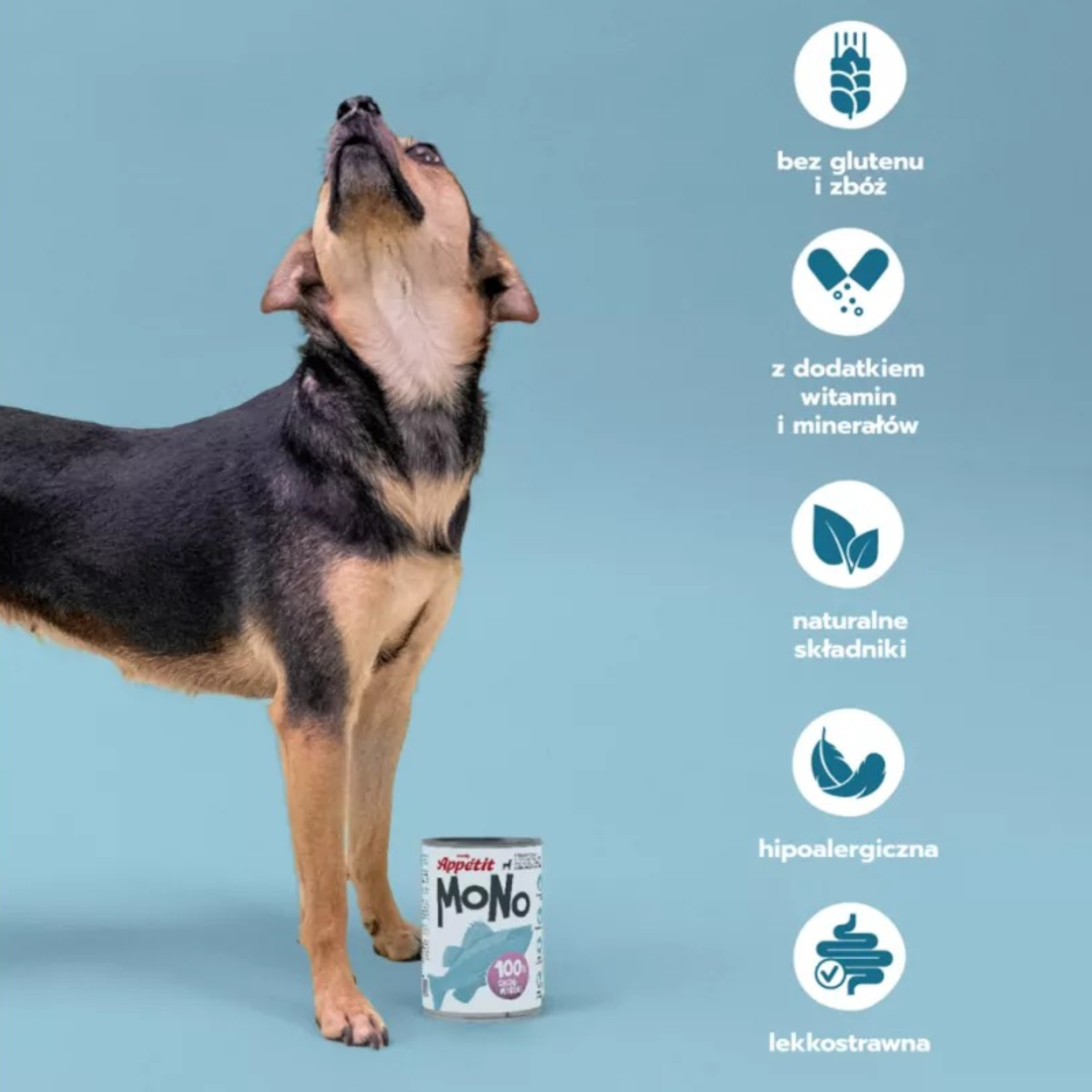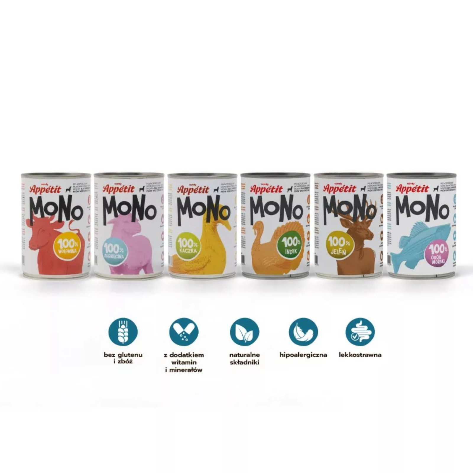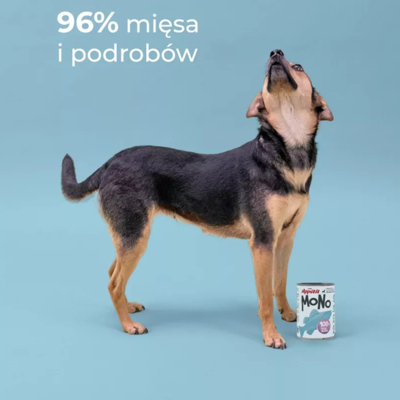 Comfy Appetit MONO to pełnoporcjowa, jednobiałkowa mokra karma dla psów dorosłych, stworzona na bazie naturalnych składników. Produkt zawiera 96% mięsa i składników pochodzenia zwierzęcego.