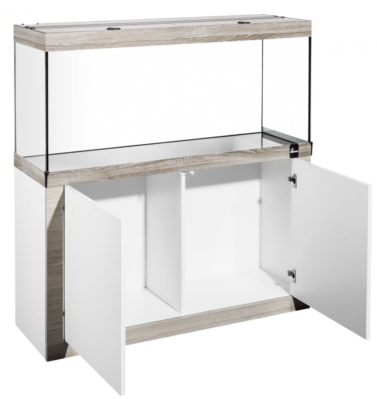 Szafki wykonane są z wysokiej jakości płyty meblowej w czterech wariantach kolorystyczych, a wewnątrz nich jest dużo miejsca na przechowywanie niezbędnych akcesoriów akwarystycznych. Drzwi zamykane są w sposób dotykowy.