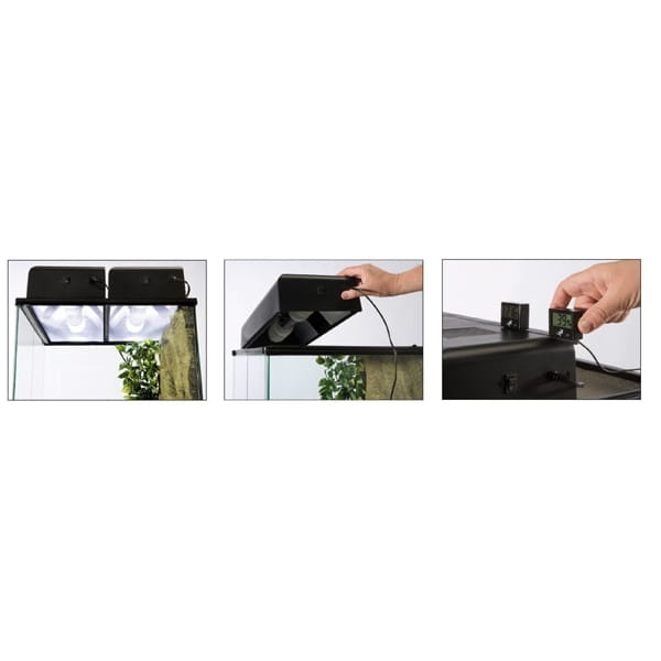Pokrywa z oprawą na żarówkę, zaprojektowana do użytku z terrariami Exo Terra z serii Mini. Pozwala na montaż różnych świetlówek kompaktowych zapewniających promieniowanie ultrafioletowe lub żarówek grzewczych do podniesienia temperatury powietrza. Dodatkowe akcesoria, takie jak elektroniczny termometr i higrometr Exo Terra można umieścić w specjalnej szynie w pokrywie.
