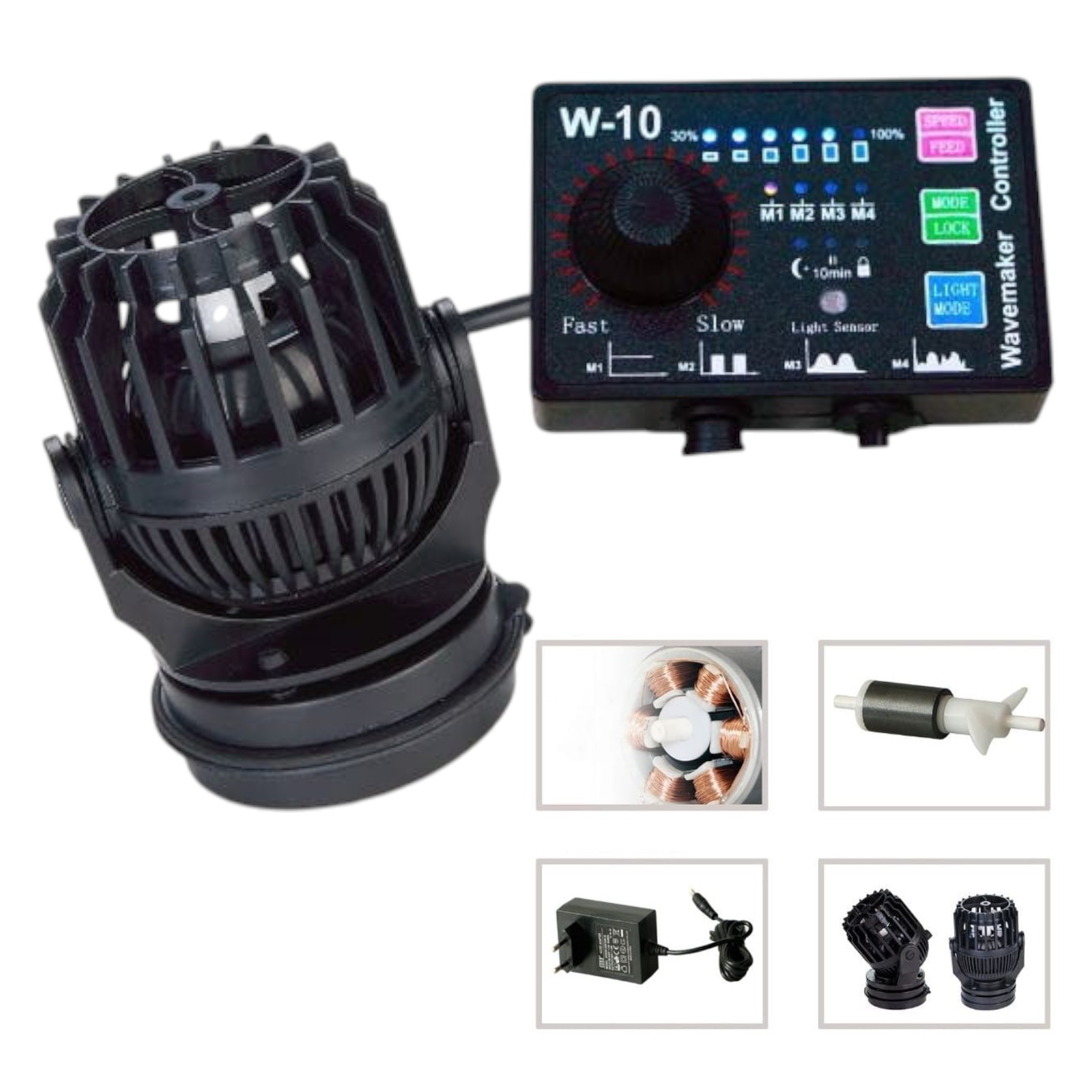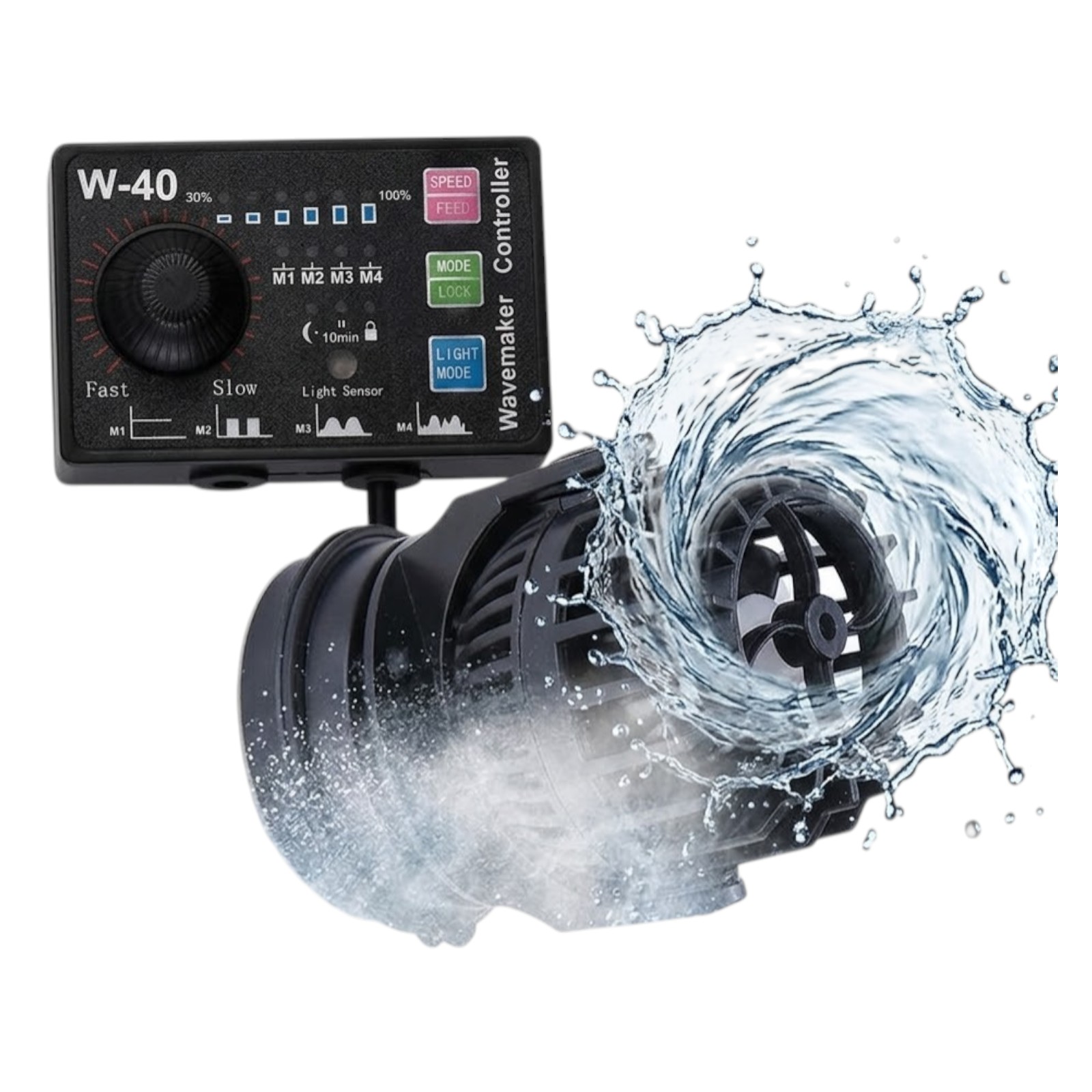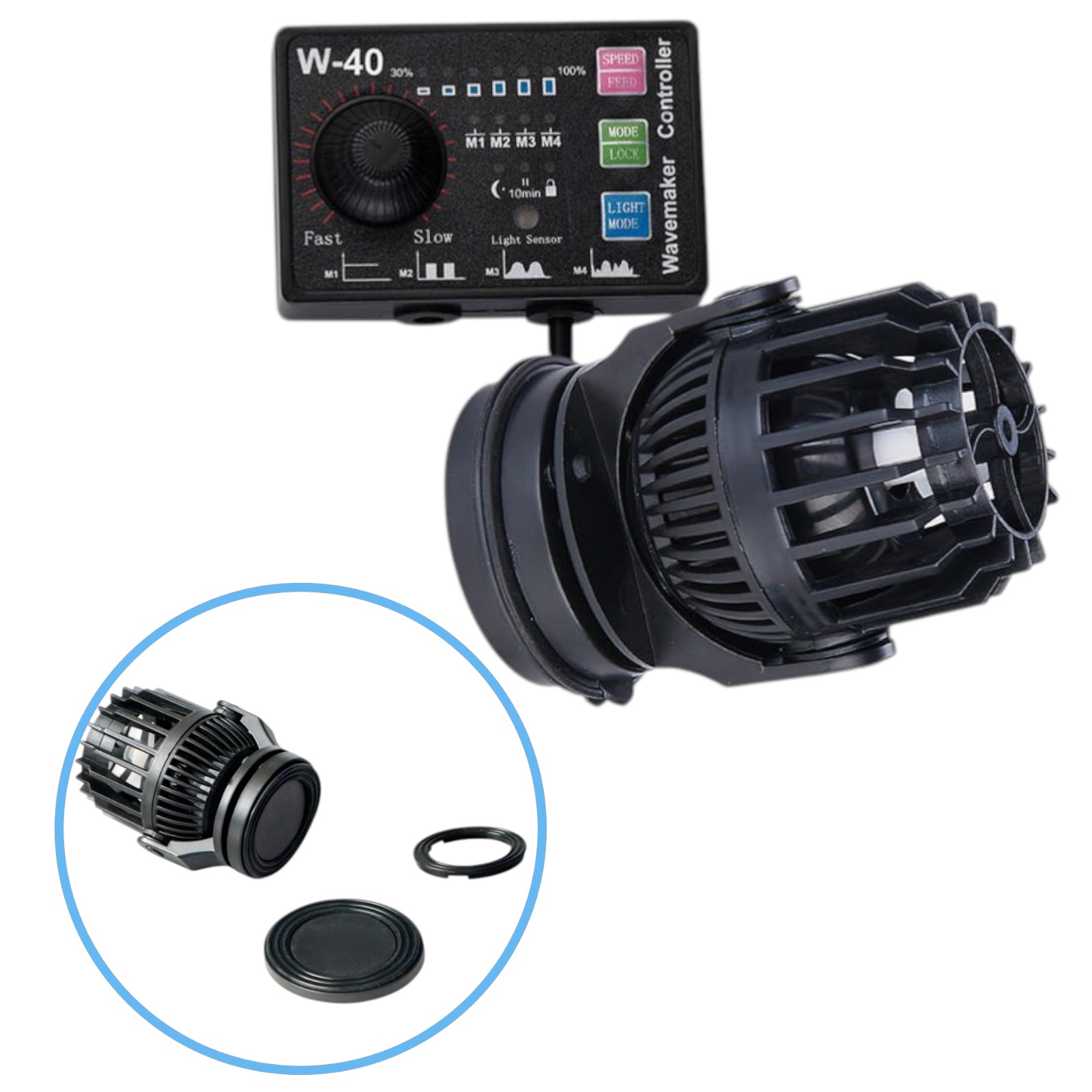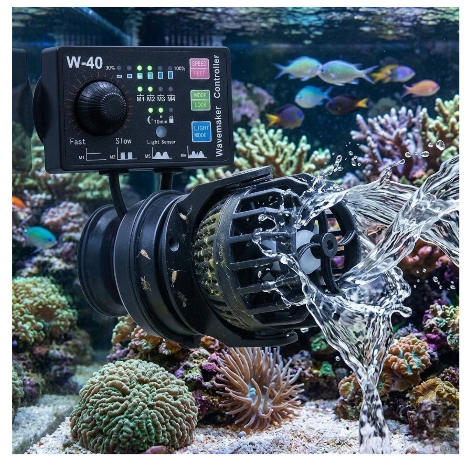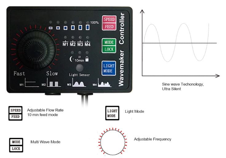 Dodatkowo kontroler wyposażono w czujniki zmierzchu. Dzięki temu w nocy zmniejszana jest wydajność pomp do minimum co symuluje naturalne działanie sił pływowych. Przydatna jest również funkcja FEED wstrzymująca pracę pompy na o. 10min np. na czas karmienia ryb i korali oraz LOCK blokująca przyciski, zapobiegająca przypadkowemu przełączeniu zadanych parametrów.