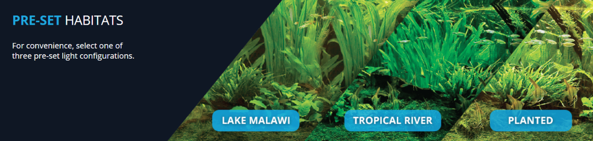 Możliwość ustawienia automatycznych kofirugarcji producenta i wybrać jedną z trzech: Malawi, tropikalna rzeka lub typow roślinne akwarium.
