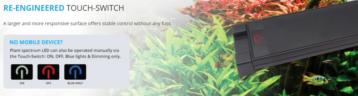 Fluval Plant ma większy przełącznik niż poprzedni model, wodoodporność IP67 i duży rozsył światła.