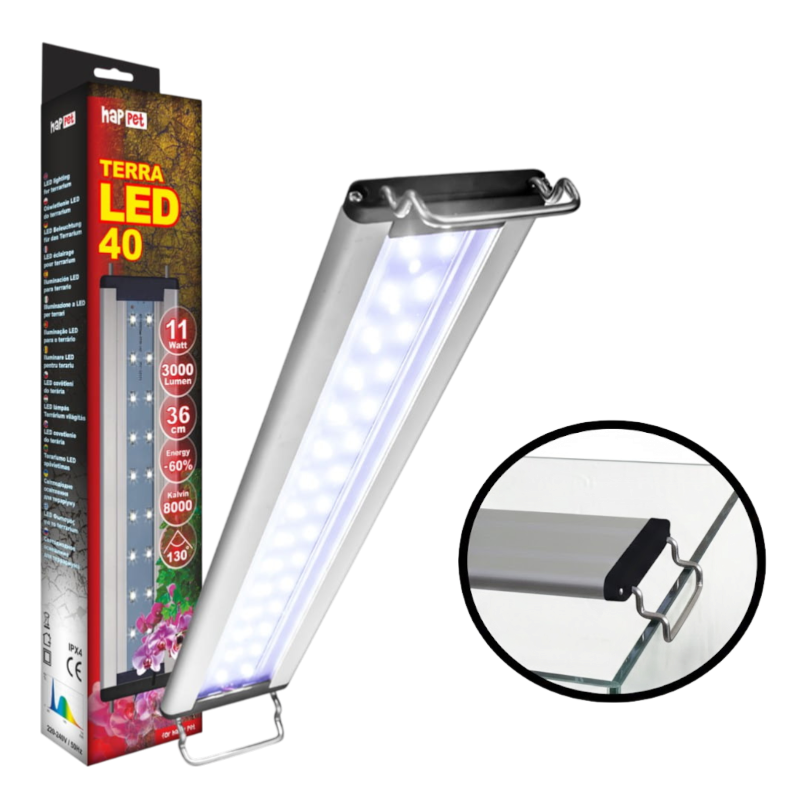 - Solidna, a jednocześnie cienka aluminiowa obudowa z plastikowymi elementami jest elegancka i nowoczesna. Regulowane nóżki umożliwiają stabilne zamocowanie na krawędziach terrarium.