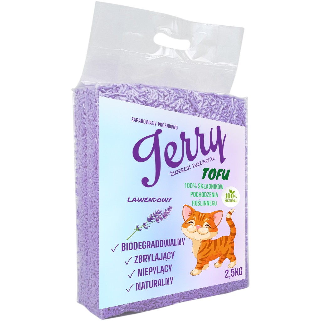 Jerry TOFU Ekologiczny Zbrylający Żwirek dla Kota – zapach lawendy, opakowanie 2,5 kg, produkt w 100% roślinny, biodegradowalny, o delikatnym zapachu lawendy, neutralizuje nieprzyjemne zapachy i ułatwia utrzymanie czystości w kuwecie.