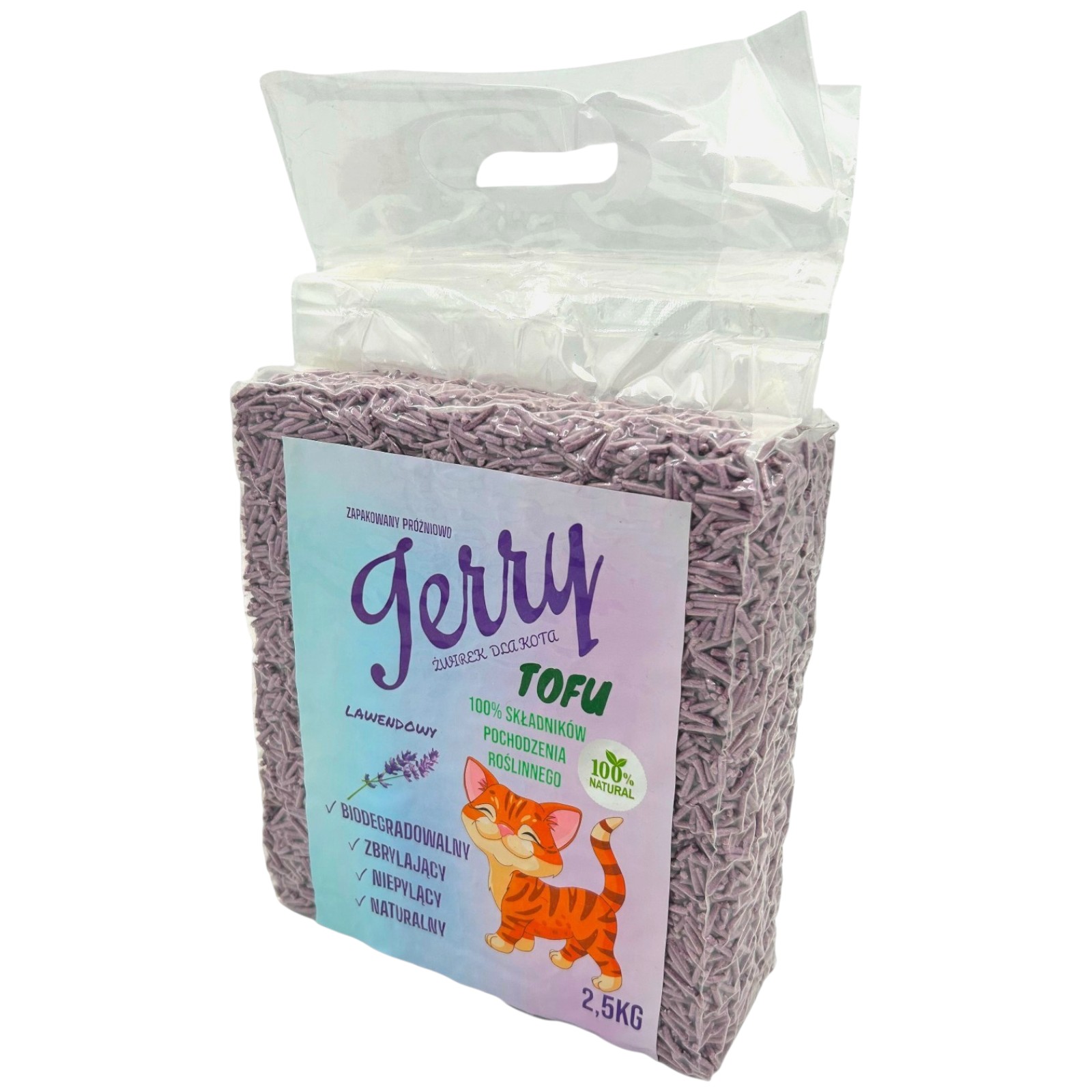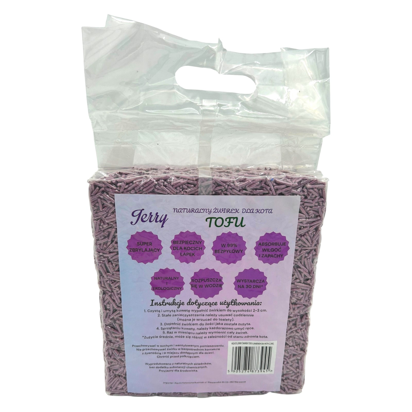 Jerry TOFU Ekologiczny Zbrylający Żwirek dla Kota – zapach lawendy, opakowanie jednostkowe 2,5 kg, produkt w 100% roślinny, biodegradowalny, o delikatnym zapachu lawendy, neutralizuje nieprzyjemne zapachy i ułatwia utrzymanie czystości w kuwecie.