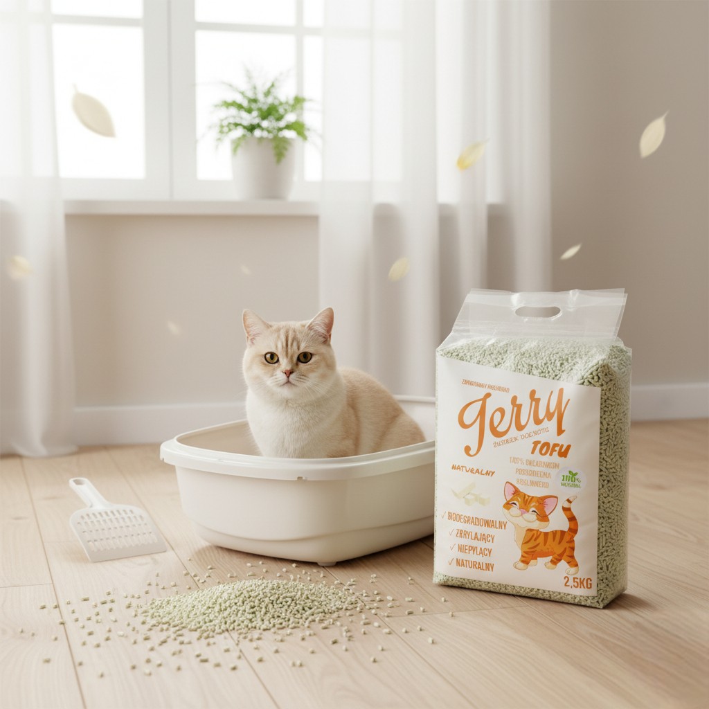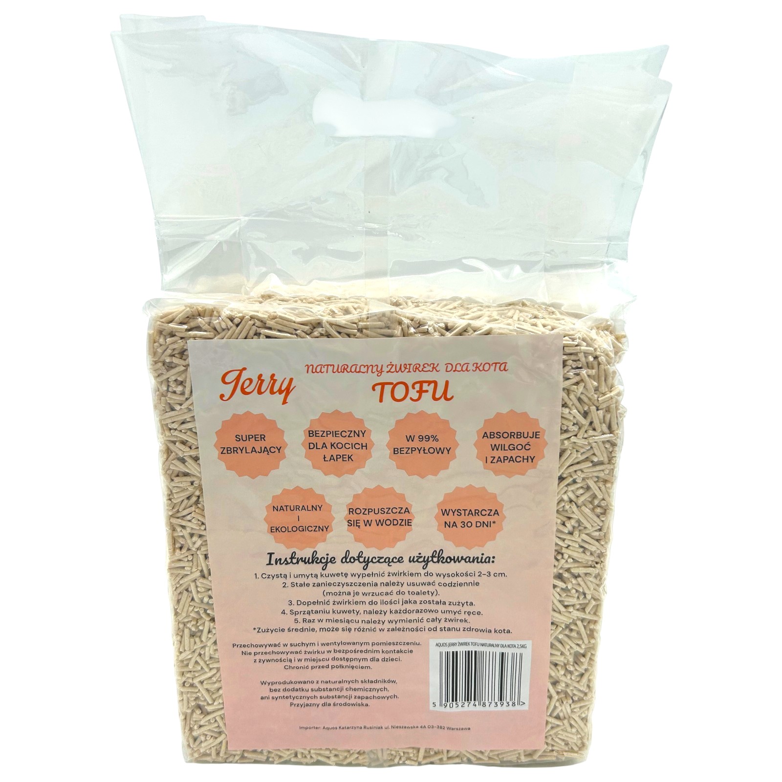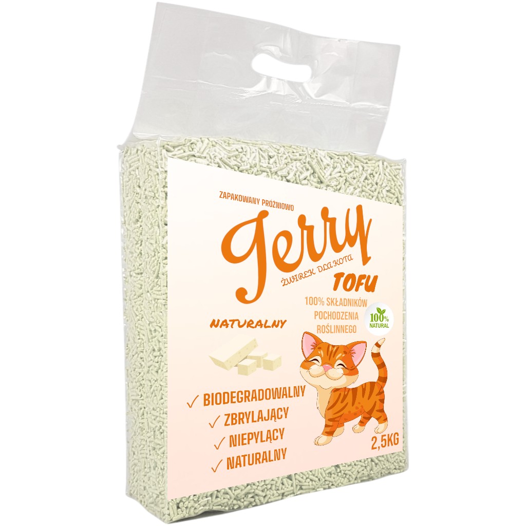 Jerry TOFU Ekologiczny Zbrylający Żwirek dla Kota – bezzapachowy, opakowanie 2,5 kg, produkt w 100% roślinny, biodegradowalny, naturalny, neutralizuje nieprzyjemne zapachy i ułatwia utrzymanie czystości w kuwecie.