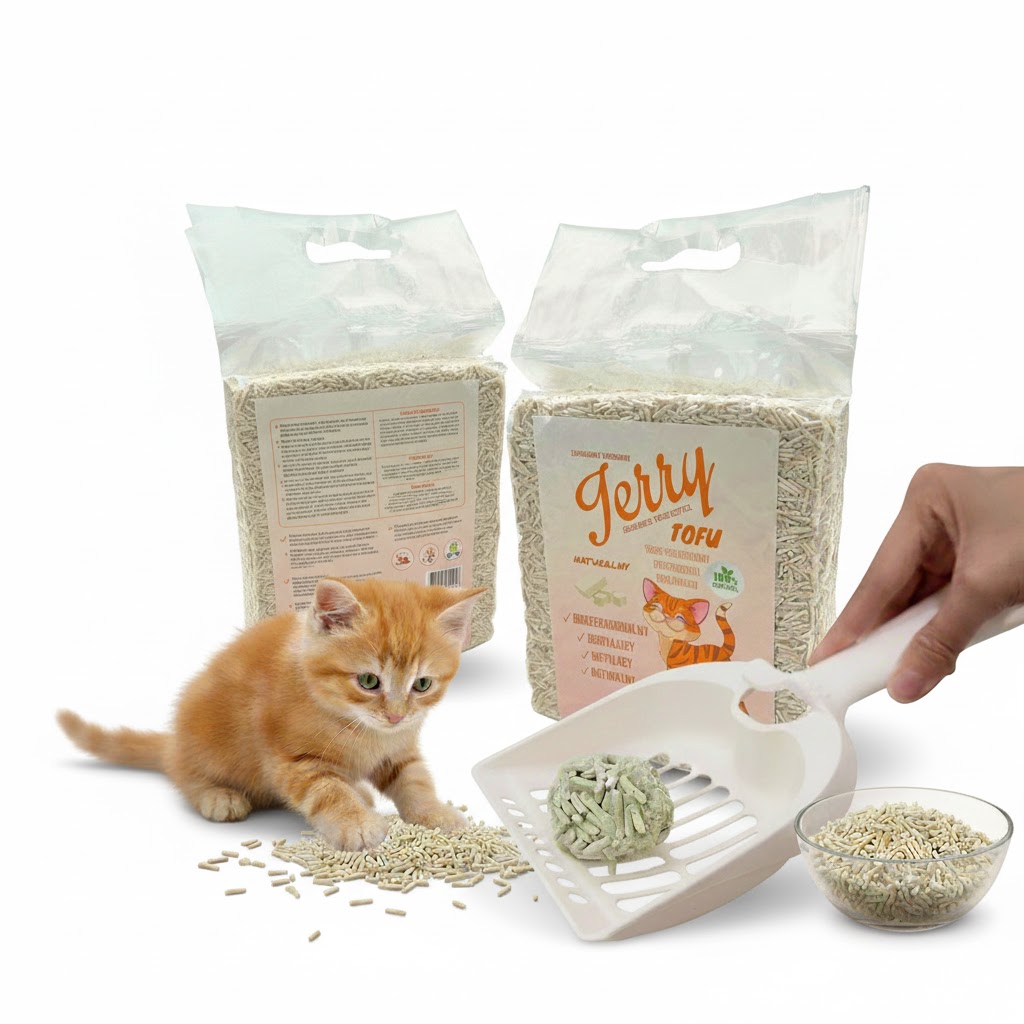 Jerry TOFU to nowoczesny, ekologiczny żwirek stworzony z naturalnych składników roślinnych, przyjazny dla środowiska i dla kota. Dzięki odpowiedniej strukturze i składnikom ma wysoką zdolność absorpcji wilgoci, co pozwala na szybkie zbrylanie i ograniczenie wilgoci w kuwecie. Zbrylane partie tworzą zwarte granulki, które łatwo usunąć szufelką bez rozkruszania i zabrudzeń wokół kuwety.
