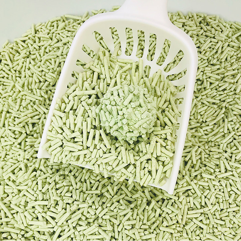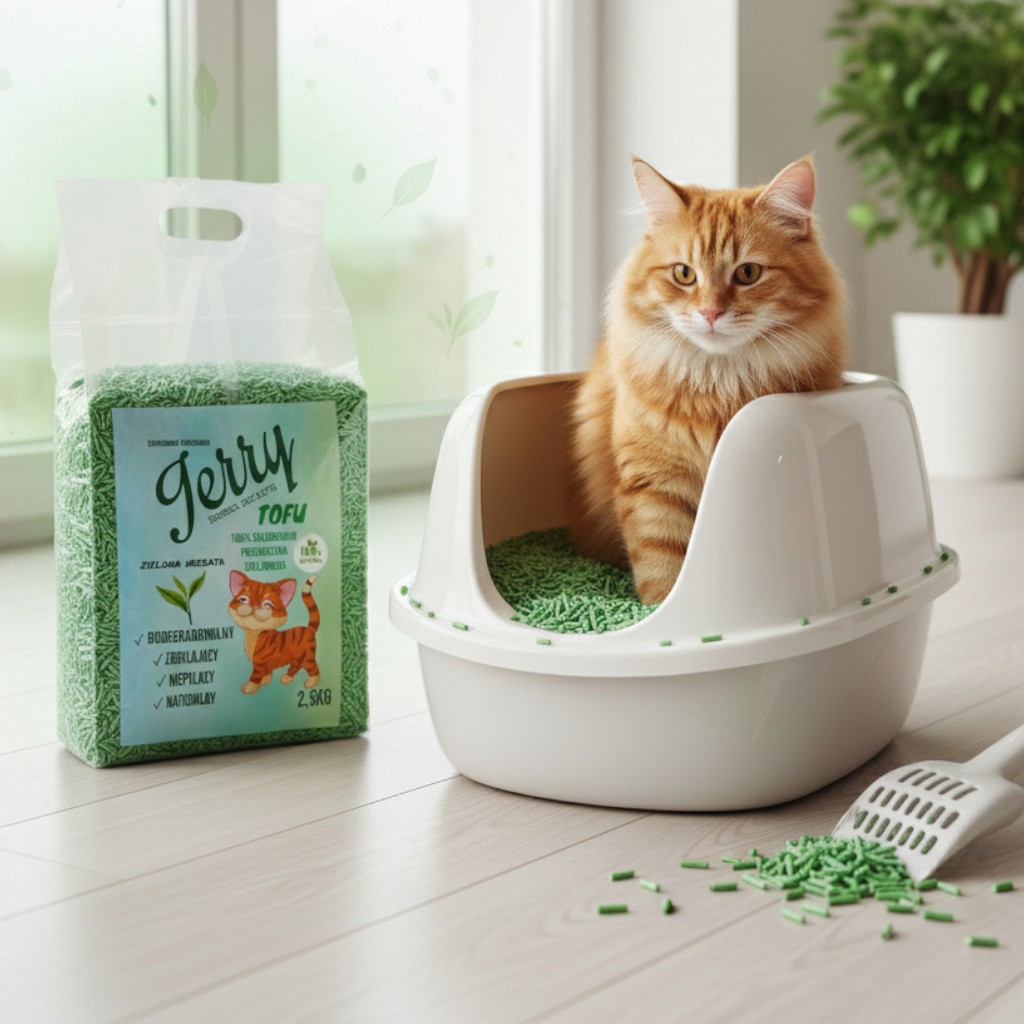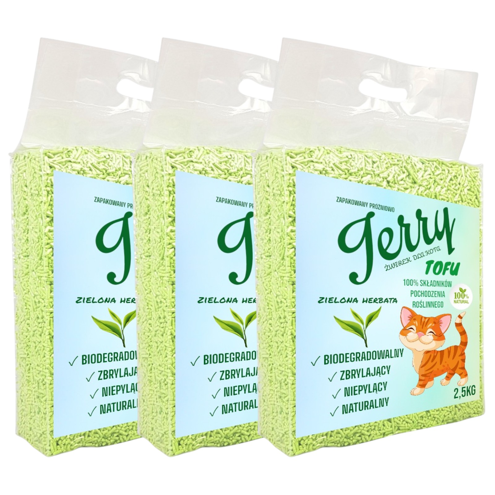 Jerry TOFU Ekologiczny Zbrylający Żwirek dla Kota – zapach zielonej herbaty, opakowanie jednostkowe 2,5 kg, produkt w 100% roślinny, biodegradowalny, o delikatnym zapachu zielonej herbaty, neutralizuje nieprzyjemne zapachy i ułatwia utrzymanie czystości w kuwecie.