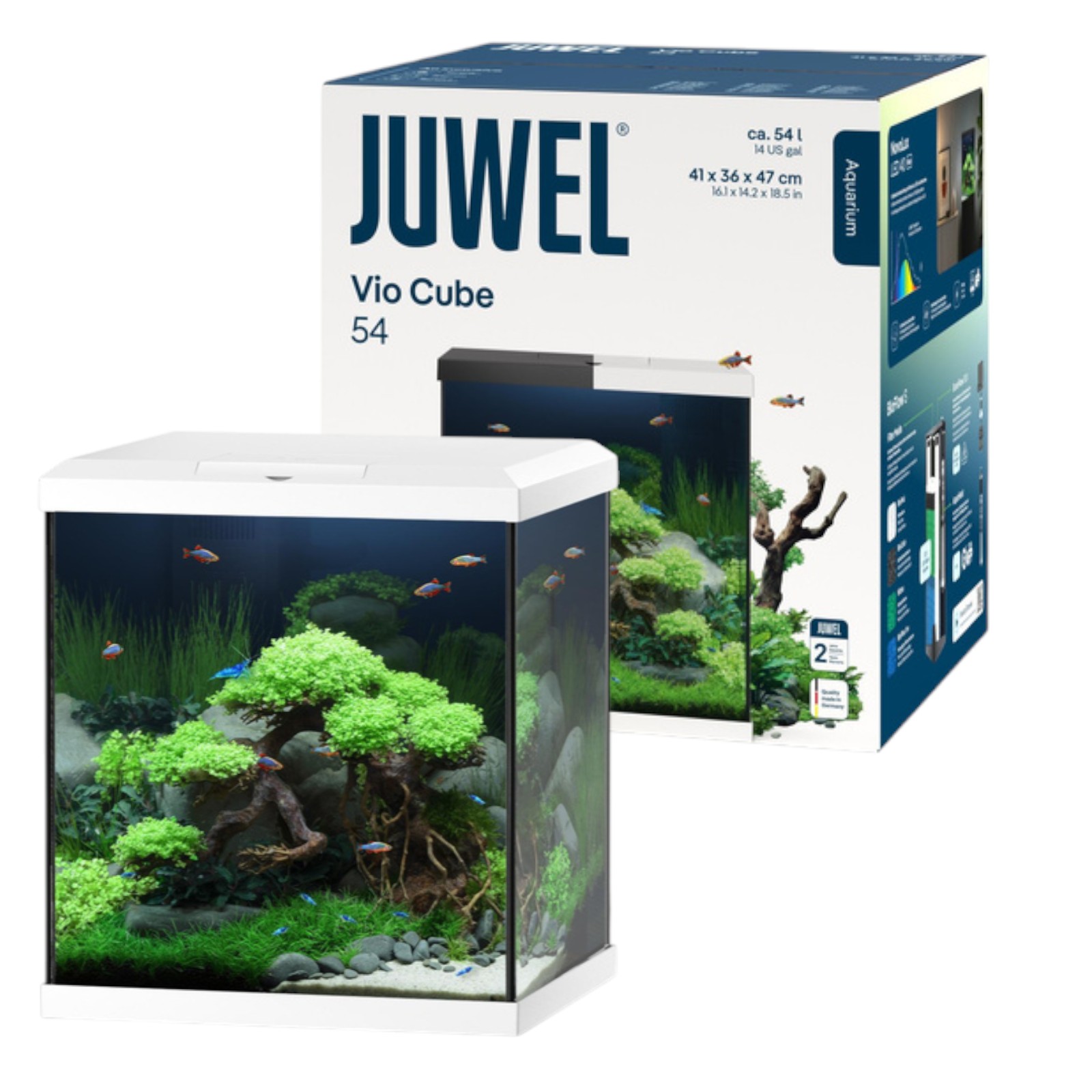Vio Cube 54 to w pełni wyposażony zestaw akwariowy zawierający odpowiednio dobrane oświetlenie, wydajny filtr oraz niezawodną grzałkę. Jest to produkt idealny na początek przygody z akwarystyką. Wymiary 41x36 cm w podstawie i objętość 54 litry pozwalają na stworzenie podwodnego świata dla ryb, roślin i innych organizmów, przy stosunkowo kompaktowym prostokątnym kształcie. Dzięki dolnej ramce zabezpieczającej zbiornik nie jest wymagana (ani wskazana) specjalna mata ani inny produkt tego typu pod akwarium.