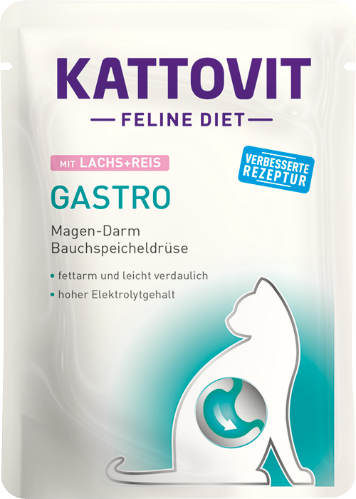 Kattovit Gastro zawiera lekkostrawne źródła białka, takie jak drób lub łosoś oraz ryż jako wysokostrawne źródło węglowodanów. Zawartość tłuszczu jest niska, aby nie obciążać dodatkowo układu pokarmowego. Dietetyczna karma dla kotów ma wysoką zawartość elektrolitów, aby zrekompensować ewentualne straty elektrolitów. Dietetyczna karma dla kotów składa się z delikatnych kawałków w sosie i jest również dobrze akceptowana przez wiele kotów o zmniejszonym apetycie.