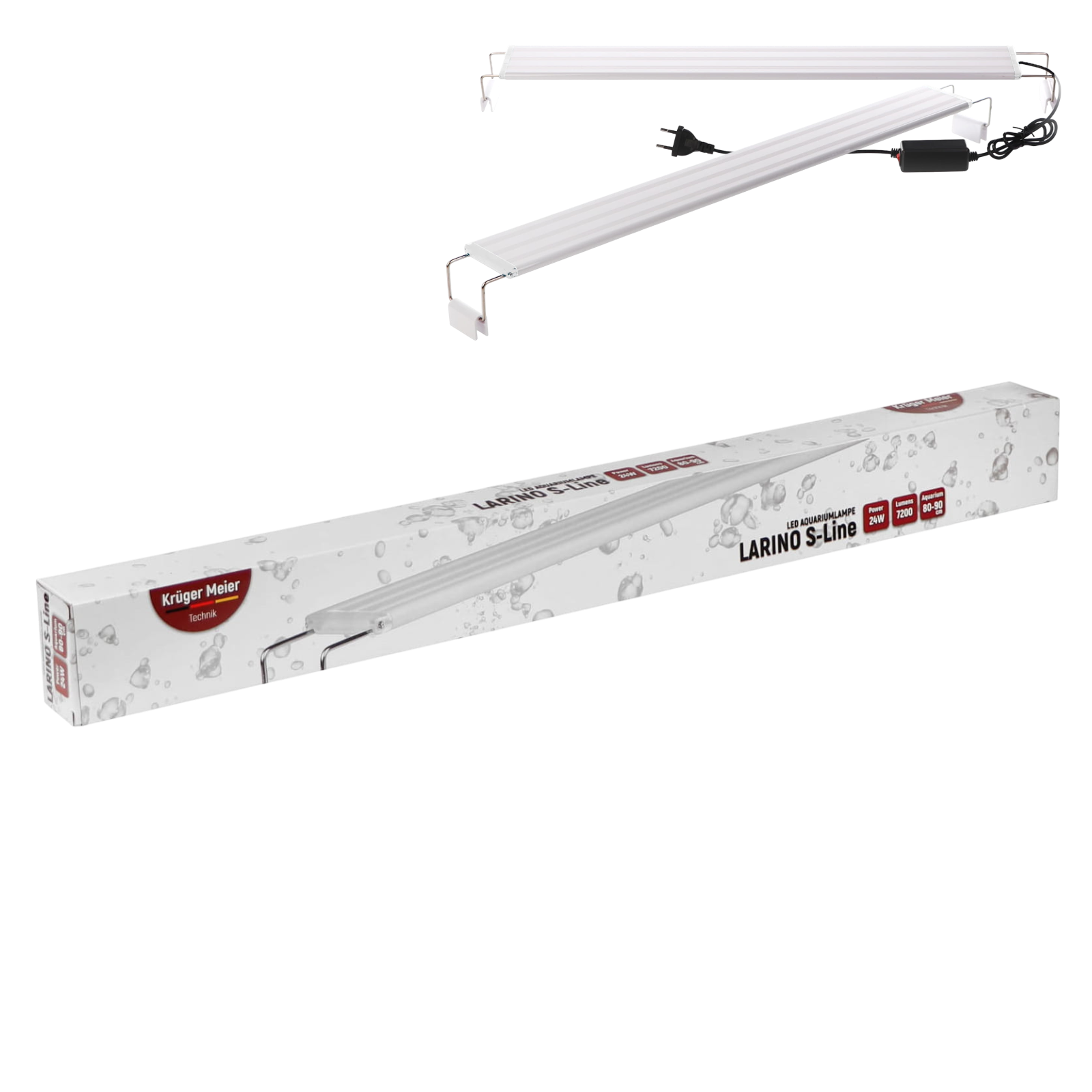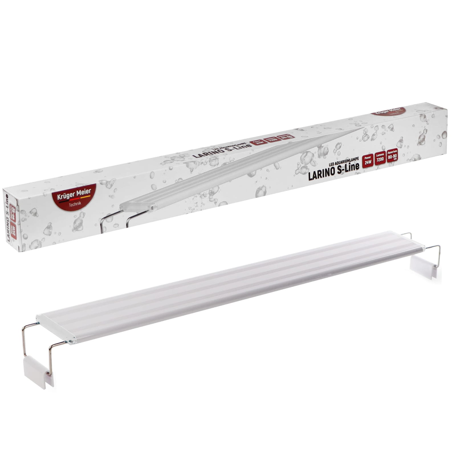 Kruger Meier Larino S-Line to seria oświetlenia LED o mikro rozmiarach i nowoczesnym wyglądzie, dedykowana do zbiorników słodkowodnych roślinnych. Lampy cechują się doskonałą mocą świetlną za którą odpowiadają energooszczędne diody High Brightnes LED. Główne światło to połączenie barwy białej 6500K, 7000K z 10000K. Dodatkowo, lampa posiada niebieskie diody LED, które nadają żywsze kolory roślinom.