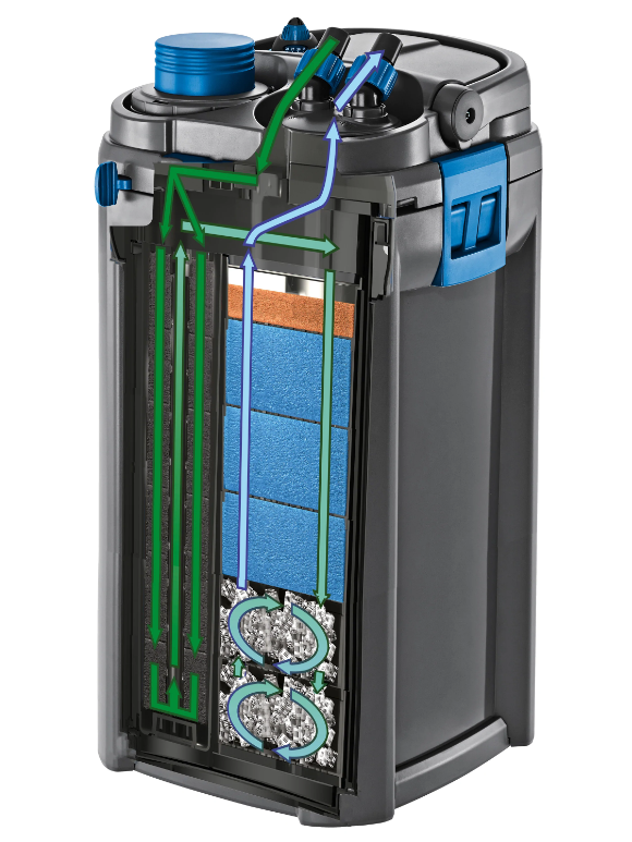 - Doskonała jakość wody dzięki dużej objętości filtra składającego się z materiału Hel-X i gąbek filtracyjnych