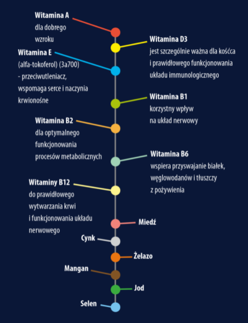 Dodatki dietetyczne na 1 kg: witaminy, prowitaminy: Witamina A (E672) 20000 j.m., Witamina D3 (E671) 1400 j.m., Witamina E (α-tokoferol) (3a700) 400mg, Witamina B1 1mg, Witamina B2 4mg, Witamina B6 (3a831) 1mg, Witamina B12 0,05mg,