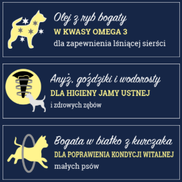 - idealny stosunek białek i tłuszczy, dostosowany do potrzeb piesków małych ras