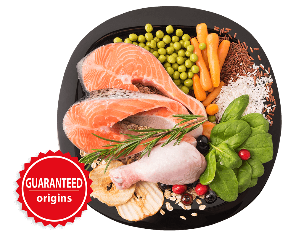 świeży łosoś 15%, odwodniony łosoś 13%, odwodniony kurczak 11%, ryż brązowy 10%, groch 10%, ryż biały 10%, groch łuskany 10%, hydrolizowane białko zwierzęce 6%, tłuszcz z kurczaka 4,5%, białko ziemniaczane, olej ze świeżego łososia 1%, suszone jabłka, minerały, suszona marchew, suszona cykoria (naturalne źródło fruktooligosacharyd [FOS] i inuliny), mannooligosacharydy (MOS), minerały, suszone żurawiny, suszone jagody, suszony szpinak, suszone brokuły, wyciągi z roślin (rozmaryn, winogrona, kurkuma, cytrusy, juka schidigera).