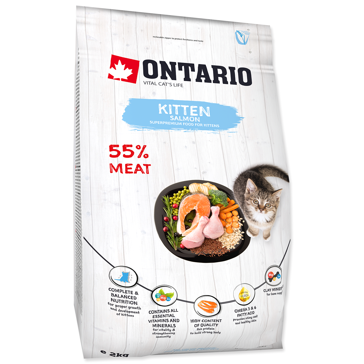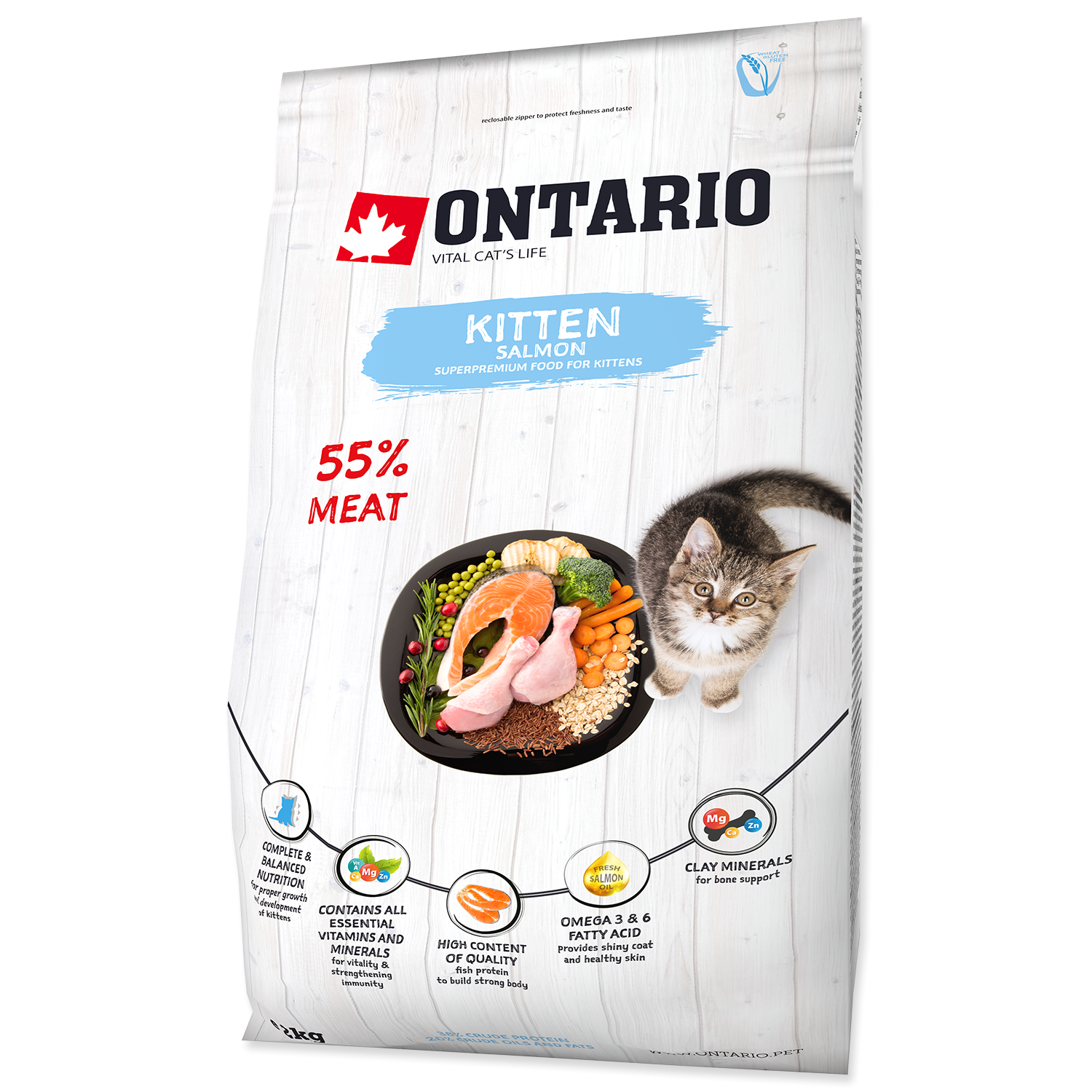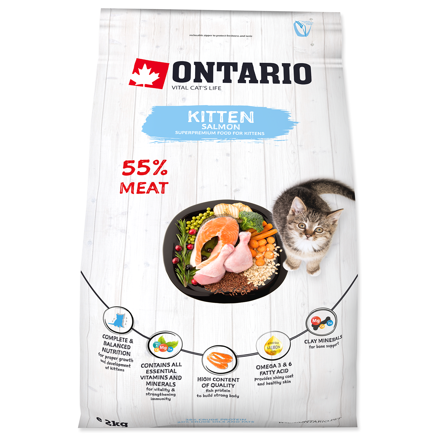 Ontario Cat Kitten to karma zawierająca niezbędne kotu kwasy tłuszczowe, omega-3 i omega-6 - dbające o zdrowie skóry i piękno sierści. Nienasycone kwasy tłuszczowe łagodzą też stany zapalne i wpływają korzystnie na układ nerwowy zwierzęcia. Właściwa równowaga kwasów DHA&EPA wspomaga też rozwój centralnego układu nerwowego młodego kota. Dodany do karmy olej ze świeżego łososia, jest nie tylko źródłem nienasyconych kwasów tłuszczowych, wpływa też na smakowitość karmy, znacznie podnosząc jej atrakcyjność. Obecne w karmie, kwasy tłuszczowe pochodzącego z oleju rybnego i z mięsa łososia, wspomagają też rozwój mózgu i wzroku.