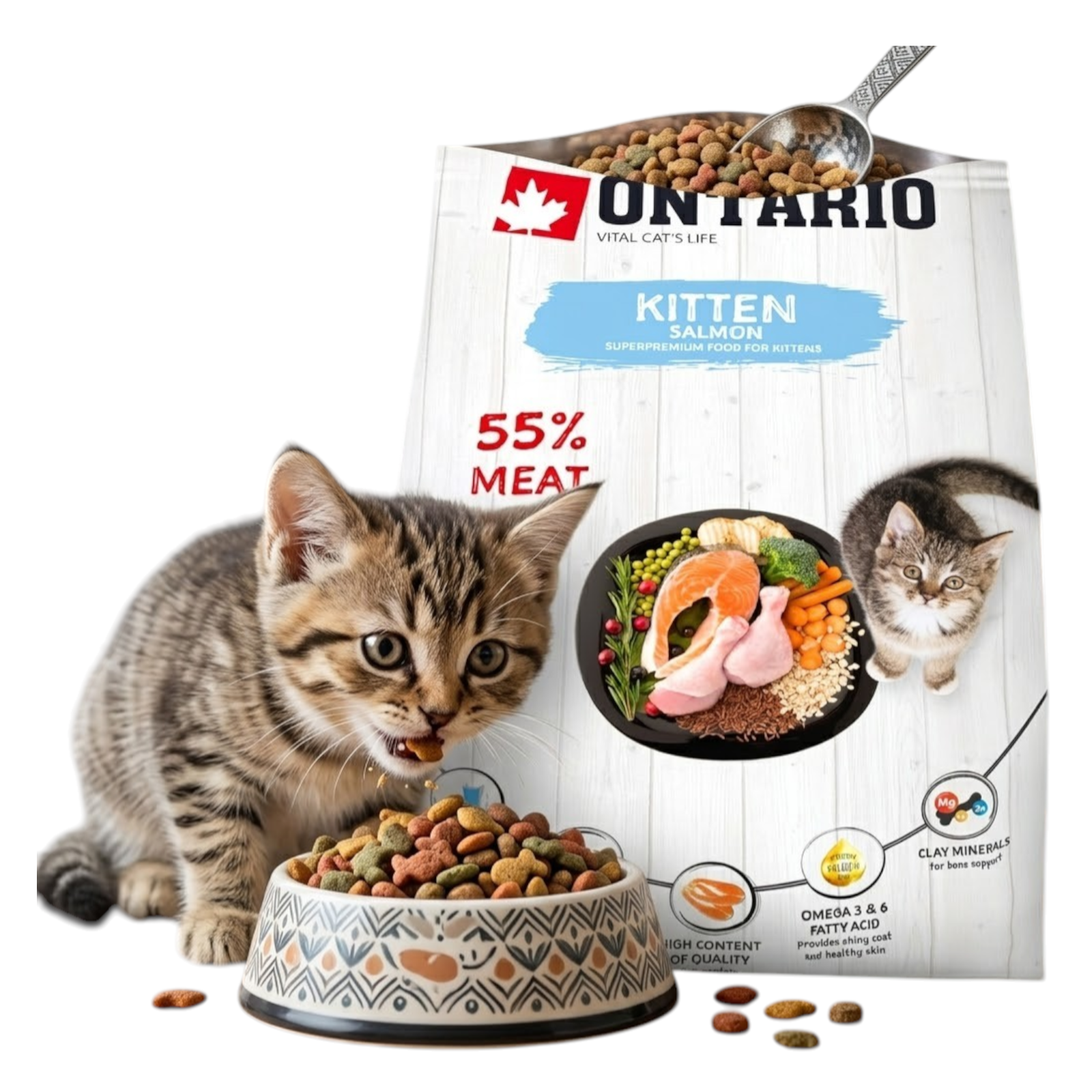 Pokarm Ontario dla kociąt zawiera owoce, warzywa i zioła, dostarczające organizmowi zwierzęcia witamin i mikroelementów, dbające o zdrowie i dobre samopoczucie kota oraz poprawiające pracę jego układu pokarmowego. W składzie tej karmy dla kotów znajdują się: suszona cykoria (naturalne źródło fruktooligosacharyd [FOS] i inuliny), suszone jabłka, suszona marchew suszone żurawiny, suszone jagody, suszony szpinak, suszone brokuły, rozmaryn, winogrona, kurkuma, cytrusy, juka schidigera, zielona herbata.