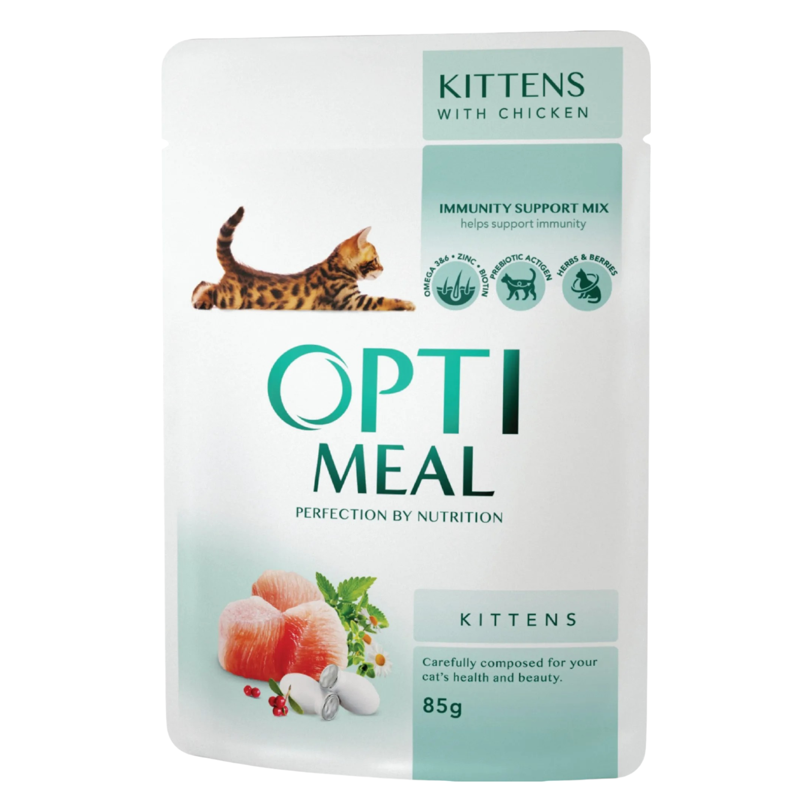 Optimeal Super Premium pełnoporcjowa mokra karma dla kociąt w wieku do jednego roku, opracowana pod kontrolą lekarzy weterynarii. Zawiera w swoim składzie delikatne mięso kurczaka, bogate w pełnowartościowe, wysokiej jakości białko, które zapewnia zdrowy wzrost i rozwój mięśni, kości i organów kotka. Unikalny mix z przydatnych ziół, jagód, wyselekcjonowanych składników mięsnych i prebiotyków tworzy codzienną naturalną ochronę odporności Twojego pupila.