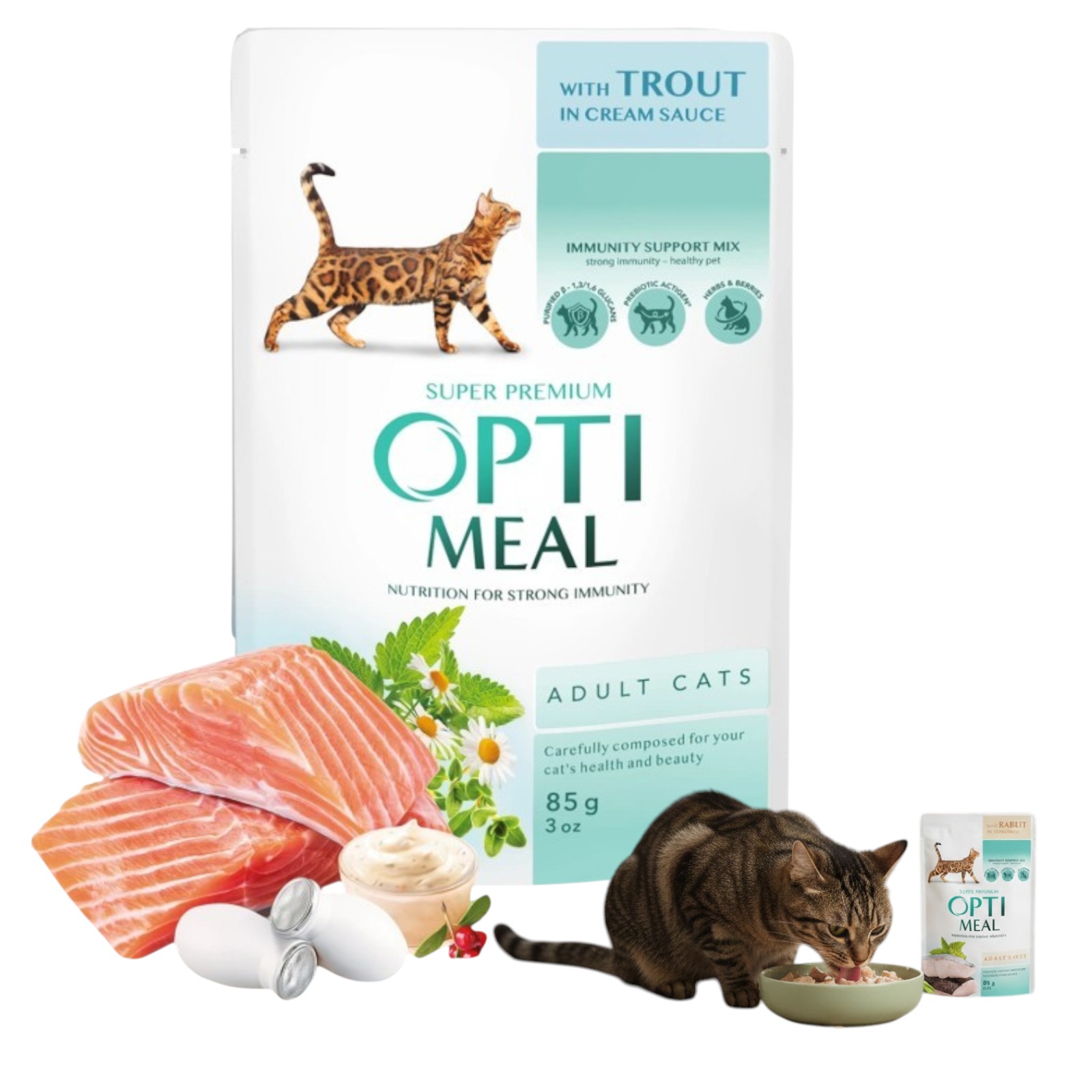 OPTIMEAL Super Premium pełnoporcjowa mokra karma dla dorosłych kotów z pstrągiem w sosie kremowym 85 g. Optimeal dla dorosłych kotów z pstrągiem w sosie kremowym — super premiowa karma dla dorosłych kotów, produkowana pod kontrolą lekarzy weterynarii. Wyjątkowa receptura zawiera wyselekcjonowane mięsne składniki, przydatne zioła, jagody, naturalne przeciwutleniacze i prebiotyki.