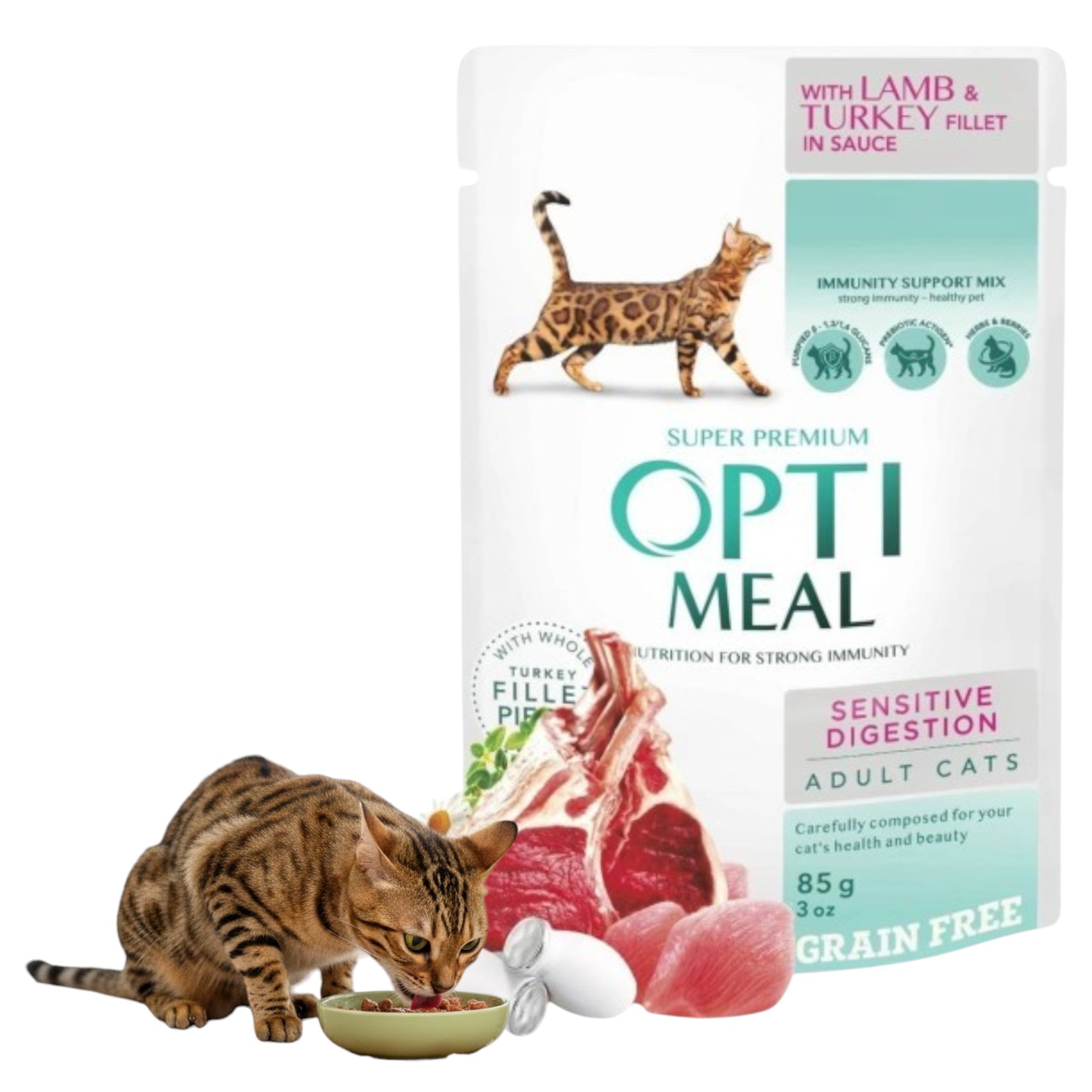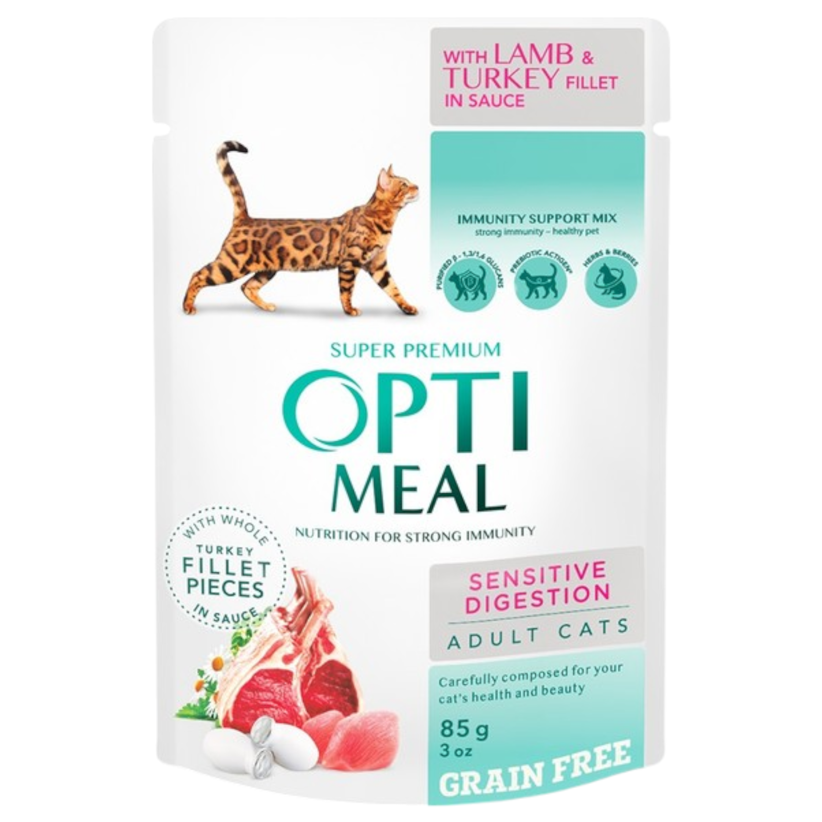 OPTIMEAL „Sensitive digestion” Super Premium bezzbożowa mokra karma dla dorosłych kotów o wrażliwym układzie trawiennym z jagnięciną i filetem z indyka w sosie. Receptura opracowana pod kontrolą lekarzy weterynarii dla zdrowia i urody zwierzęcia zawiera wyselekcjonowane mięsne składniki, zioła, jagody, naturalne przeciwutleniacze i prebiotyki.