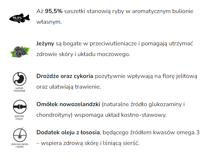 Skład: 42% Łosoś, 28,5% Bulion (rybny), 15% Śledź, 10% Pstrąg, 3% Jeżyny, 1% Minerały, 0,2% Olej z łososia, 0,1% Cykoria, 0,1% Drożdże browarnicze, 0,1% Omułek nowozelandzki.