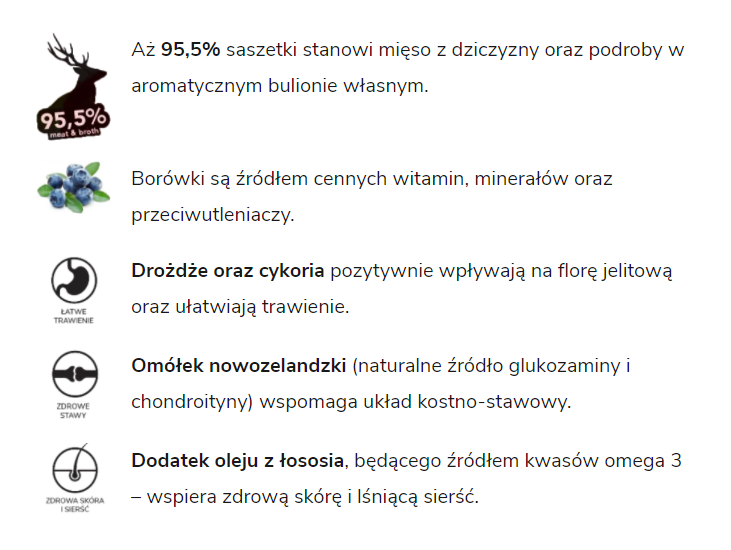 Skład: Dziczyzna 67% (serca, mięso, płuca, wątroba), 28,5% Rosół, 3% Borówka, 1% Minerały, 0,2% Olej z łososia, 0,1% Cykoria, 0,1% Omółek nowozelandzki, 0,1% Drożdże browarnicze.