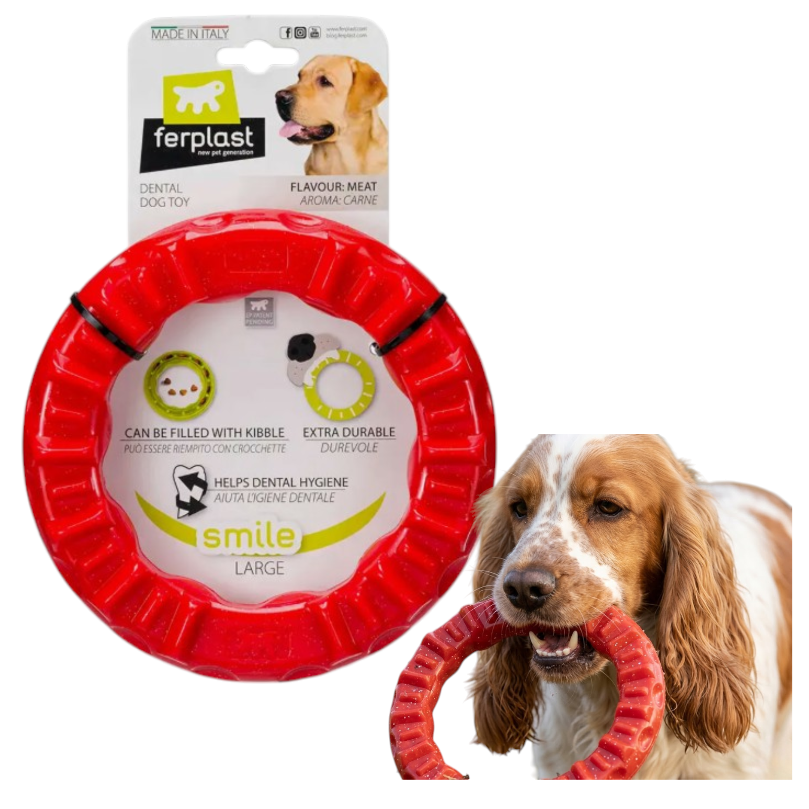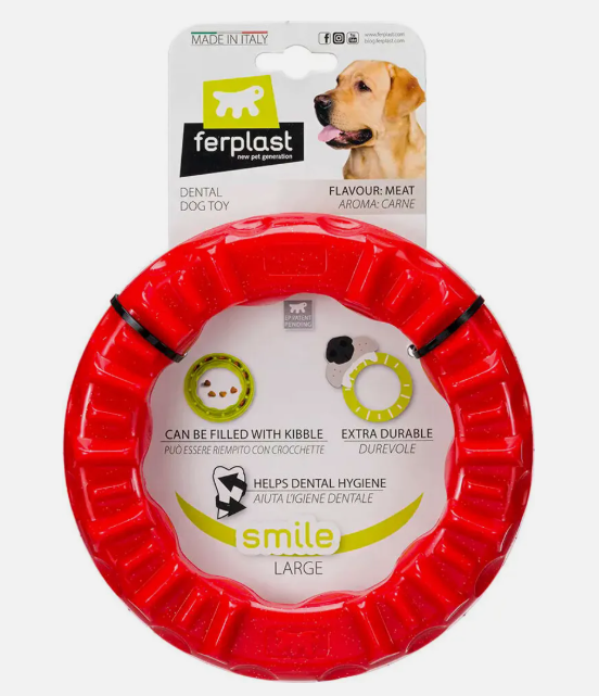 Zabawka dla psa Ferplast Smile Ring w rozmiarze M to zaawansowany gryzak dentystyczny, który łączy profilaktykę zdrowotną z fascynującą zabawą. Wykonany z twardego tworzywa skutecznie redukuje płytkę nazębną i odświeża oddech, jednocześnie oferując psu atrakcyjny mięsny smak i możliwość ukrycia ulubionych smakołyków.