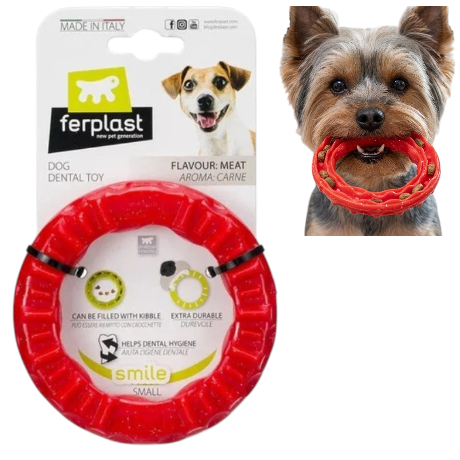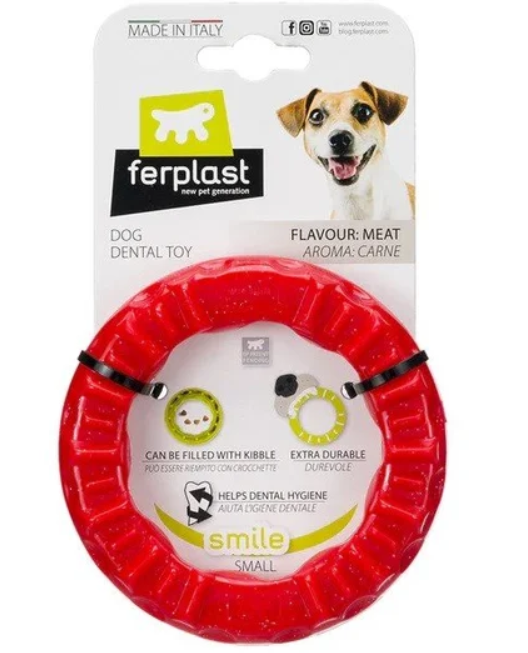 Zabawka dla psa Ferplast Smile Ring w rozmiarze S to innowacyjny gryzak w kształcie pierścienia, który łączy funkcję aktywnej zabawy z dbałością o higienę zębów. Wykonana z wytrzymałego tworzywa wyposażona w specjalny otwór na przysmaki, stanowi doskonałe narzędzie do stymulacji umysłowej oraz fizycznej psów małych i średnich ras.