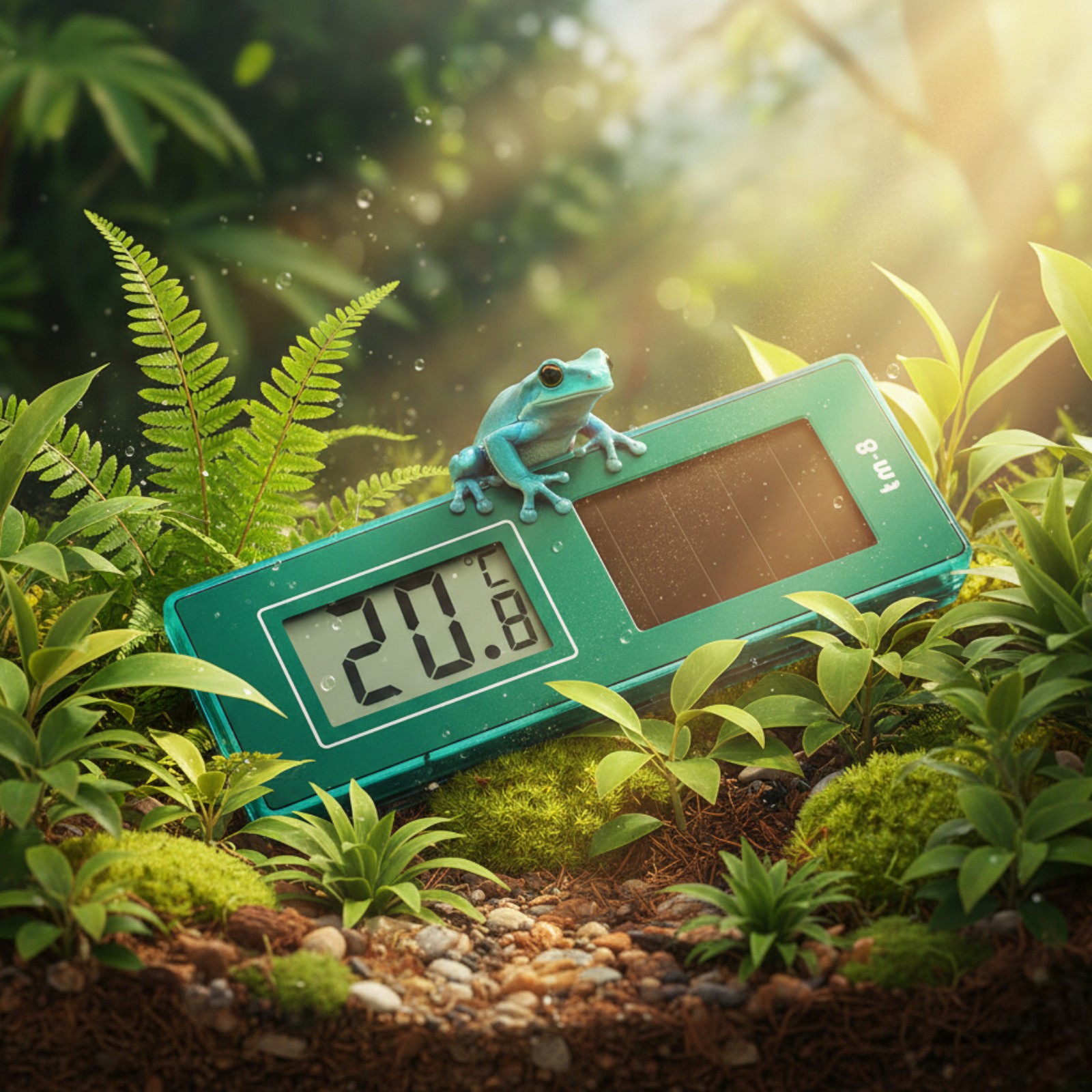 Urządzenie wykorzystuje energię świetlną do działania, eliminując konieczność stosowania tradycyjnych baterii. To rozwiązanie wygodne i ekonomiczne, szczególnie w środowiskach o podwyższonej wilgotności, gdzie wymiana baterii bywa uciążliwa. Sprawdza się zarówno przy oświetleniu naturalnym, jak i sztucznym (np. lampy terraryjne).