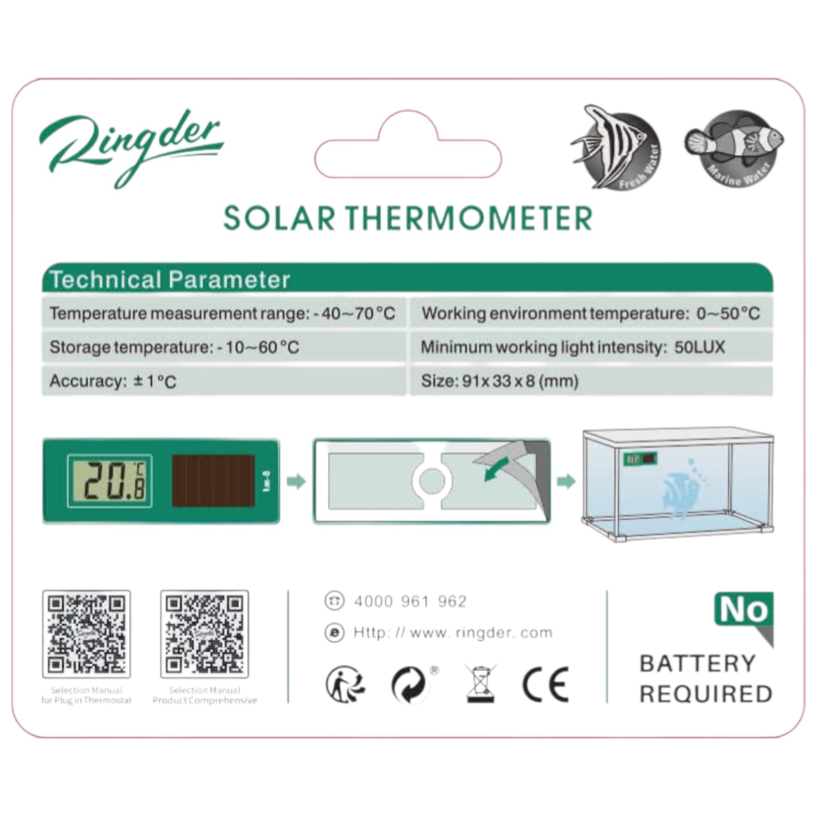 Termometr solarny zasilany energią słoneczną to praktyczne urządzenie do monitorowania temperatury w akwariach, terrariach oraz wiwariach. Umożliwia stałą kontrolę warunków środowiskowych bez konieczności stosowania klasycznych baterii. Czytelny wyświetlacz LCD zapewnia szybki odczyt temperatury, co pozwala na bieżąco kontrolować komfort zwierząt i stabilność mikroklimatu.