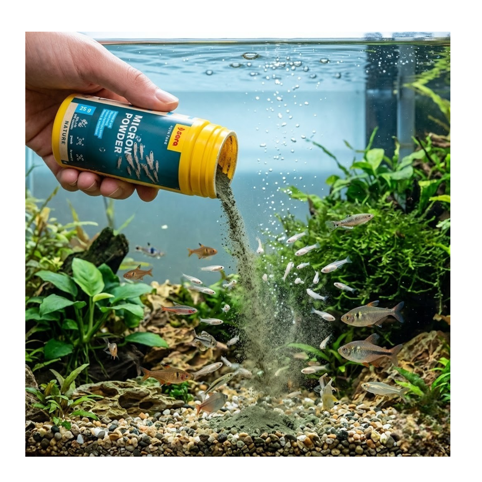 Ten drobno sproszkowany pokarm zawiera zarówno zooplankton (18% kryla), jak i fitoplankton (51% spiruliny) i składa się z drobnych cząstek unoszących się w wodzie. Micron Powder optymalnie przypomina naturalny plankton. Wspomaga zdrowy wzrost, układ odpornościowy oraz silny rozwój i wybarwienie.