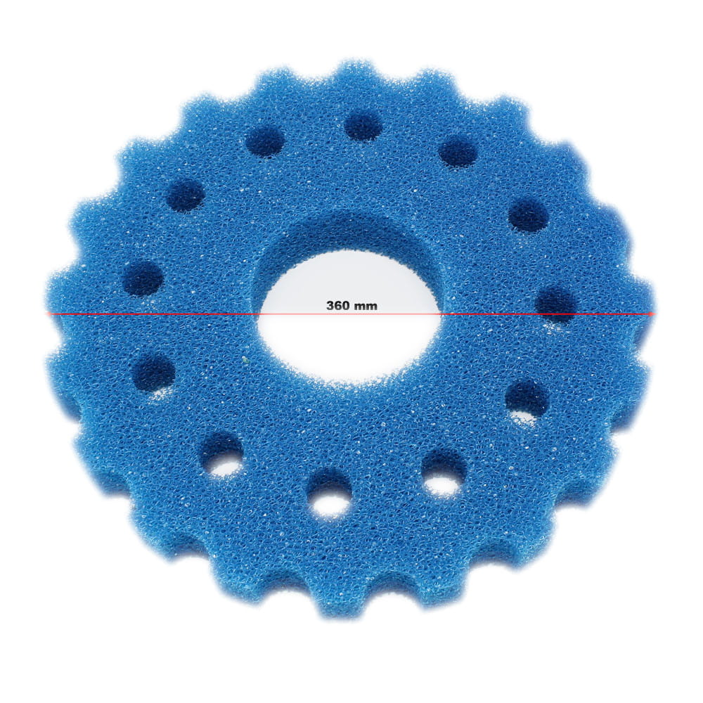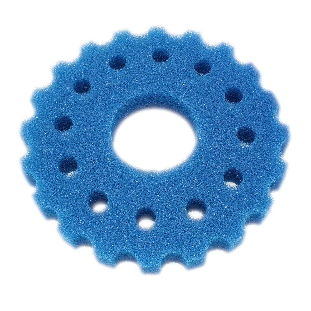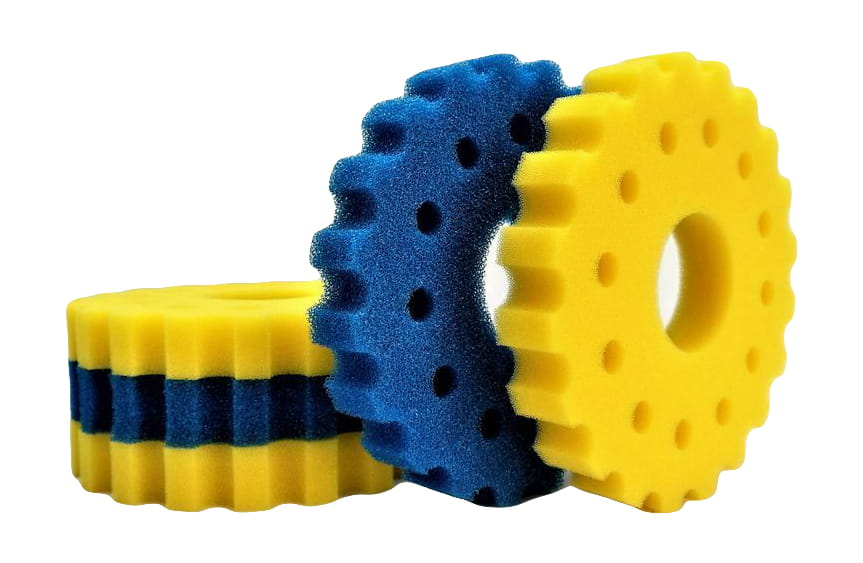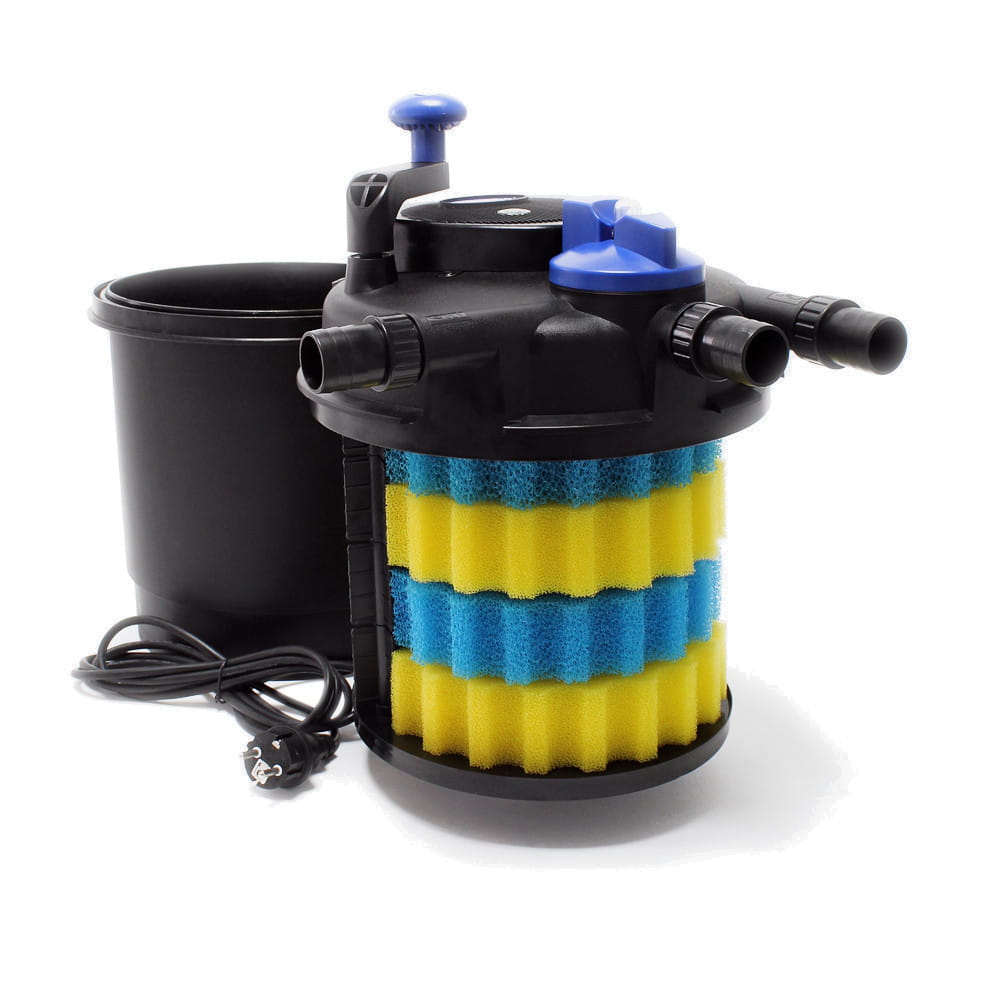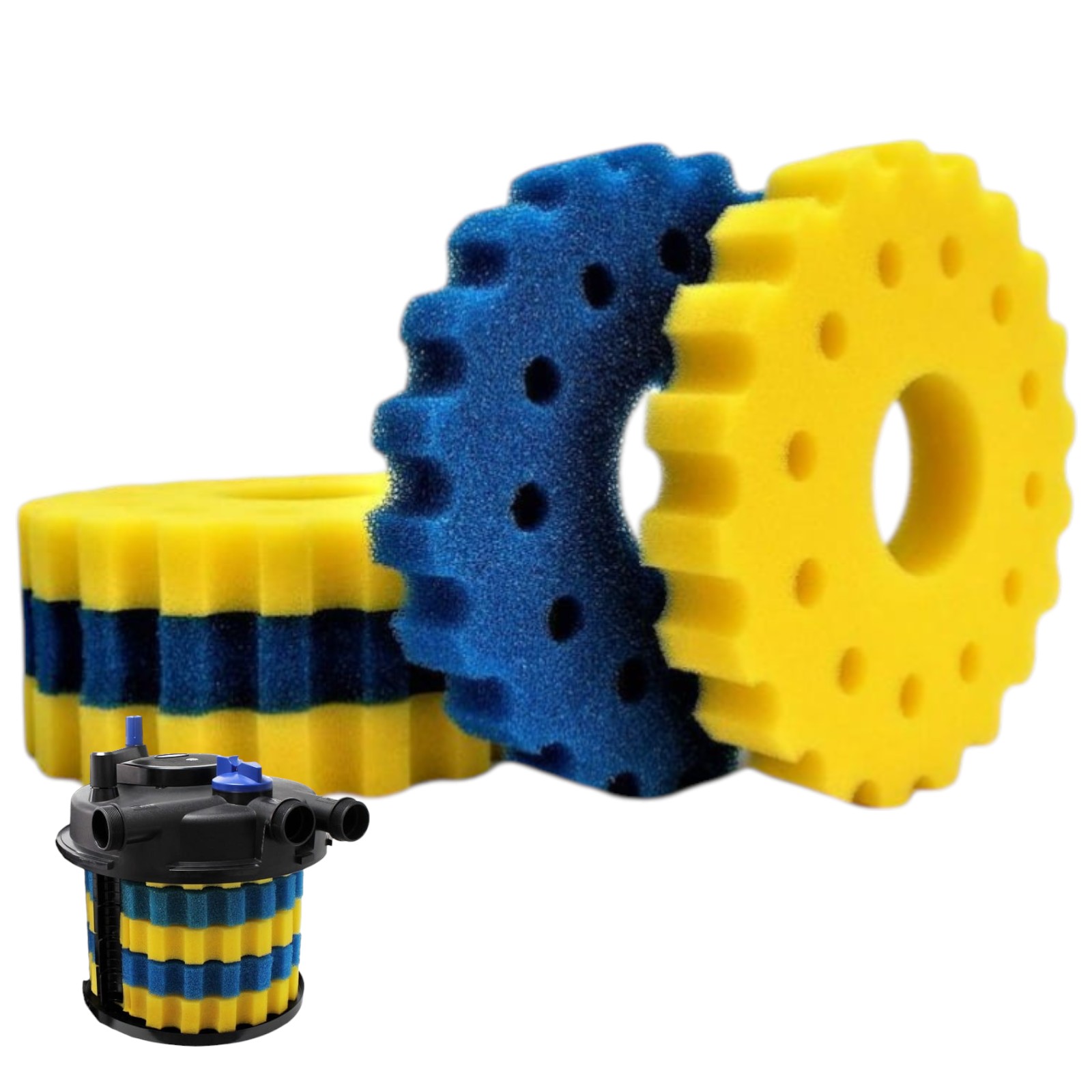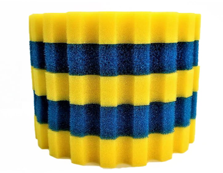 Wkład mechaniczny - bio-gąbka gruboziarnista (niebieska) x2 oraz bio-gąbka drobnoziarnista (żółta) x3, które zapewniają doskonałe oraz bardzo dokładne oczyszczenie wody z wszelkich zabrudzeń mechanicznych oraz stanowią siedlisko baterii nitryfikacyjnych, czyszczających wodę ze z toksycznych związków azotowych (przetwarzają toksyczny NH4 oraz NO3).