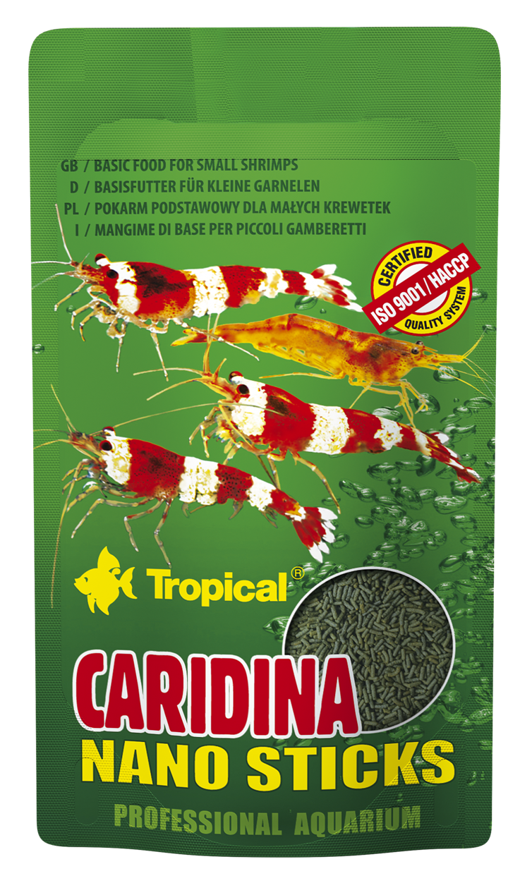 Caridina Nano Sticks to wieloskładnikowy pokarm o podwyższonej zawartości wapnia w formie tonących mikropałeczek, przeznaczony do codziennego karmienia krewetek karłowatych, np. „babaulti”, „red cherry”, „biene”, „tiger shrimp”, „blue shrimp”, „crystal red”, zwłaszcza osobników młodych oraz innych skorupiaków wodnych, w tym morskich (Lysmata amboinensis „cleaner shrimp", Thor amboinensis „sexy shrimp").