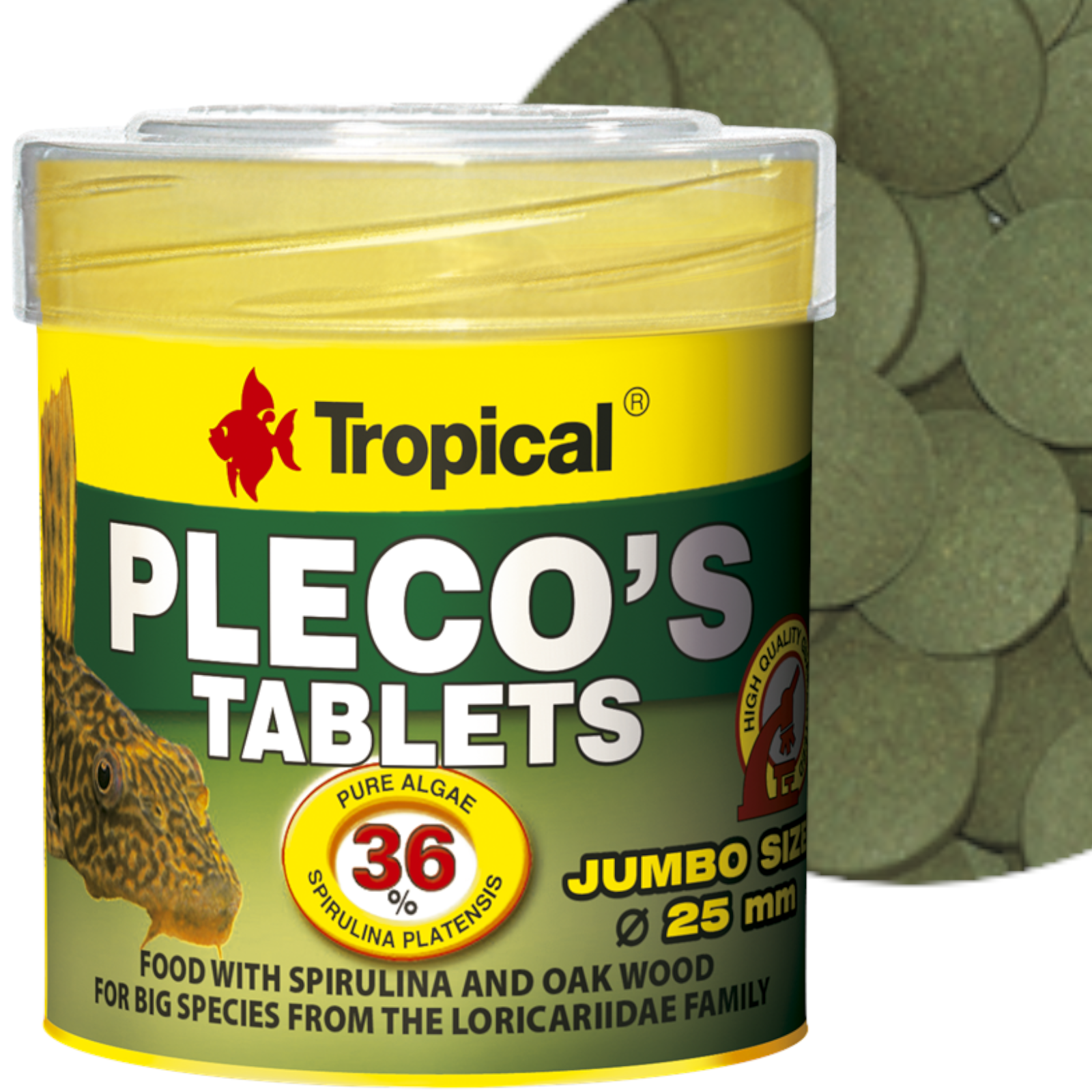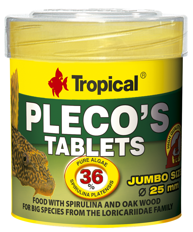 Pleco's to pokarm roślinny w postaci tonących tabletek o średnicy 25 mm, przeznaczony do codziennego karmienia dużych gatunków ryb z rodziny Loricariidae, np. Hypostomus plecostomus, Glyptoperichthys gibbiceps lub większej grupy mniejszych gatunków glonożernych zbrojników.