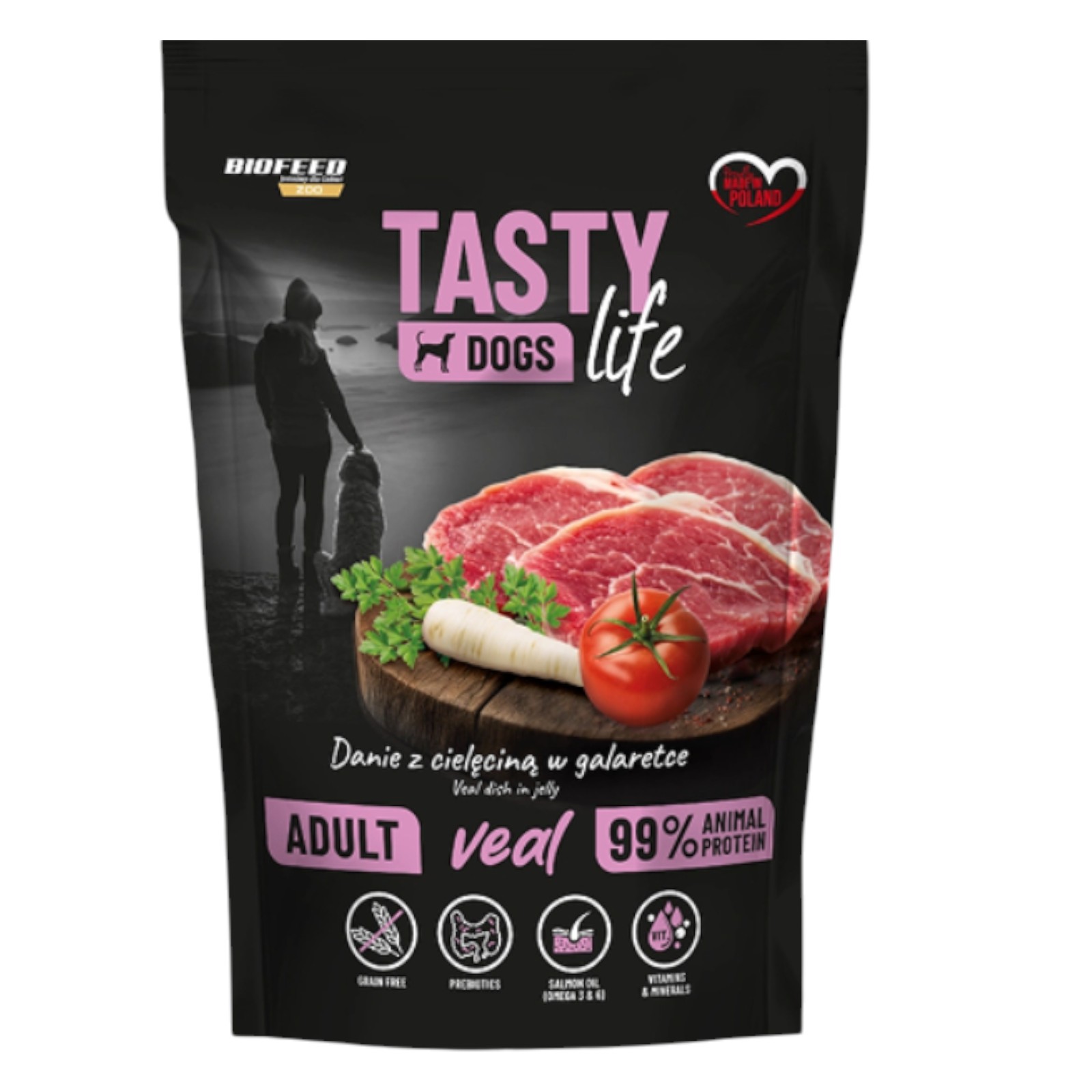 Pełnowartościowy posiłek dla dorosłych psów wszystkich ras. Mokra karma Tasty Dogs Life z cielęciną to wyjątkowo smakowite danie w galaretce, opracowane specjalnie z myślą o potrzebach dorosłych psów. Wysoka zawartość mięsa zapewnia energię, białko i składniki odżywcze niezbędne w okresie intensywnego wzrostu.