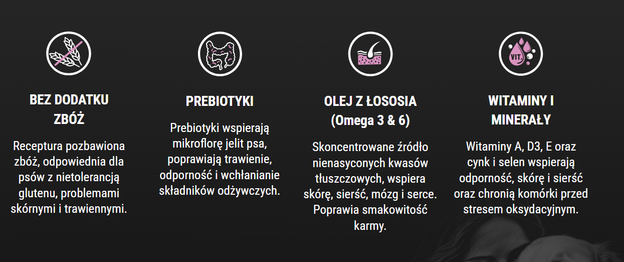 Delikatna galaretka sprawia, że karma jest atrakcyjna nawet dla wybrednych smakoszy, a forma mokrego posiłku ułatwia pobieranie pokarmu psom. Receptura nie zawiera zbóż, co obniża ryzyko nietolerancji pokarmowych i jest korzystne dla wrażliwego przewodu pokarmowego psów.